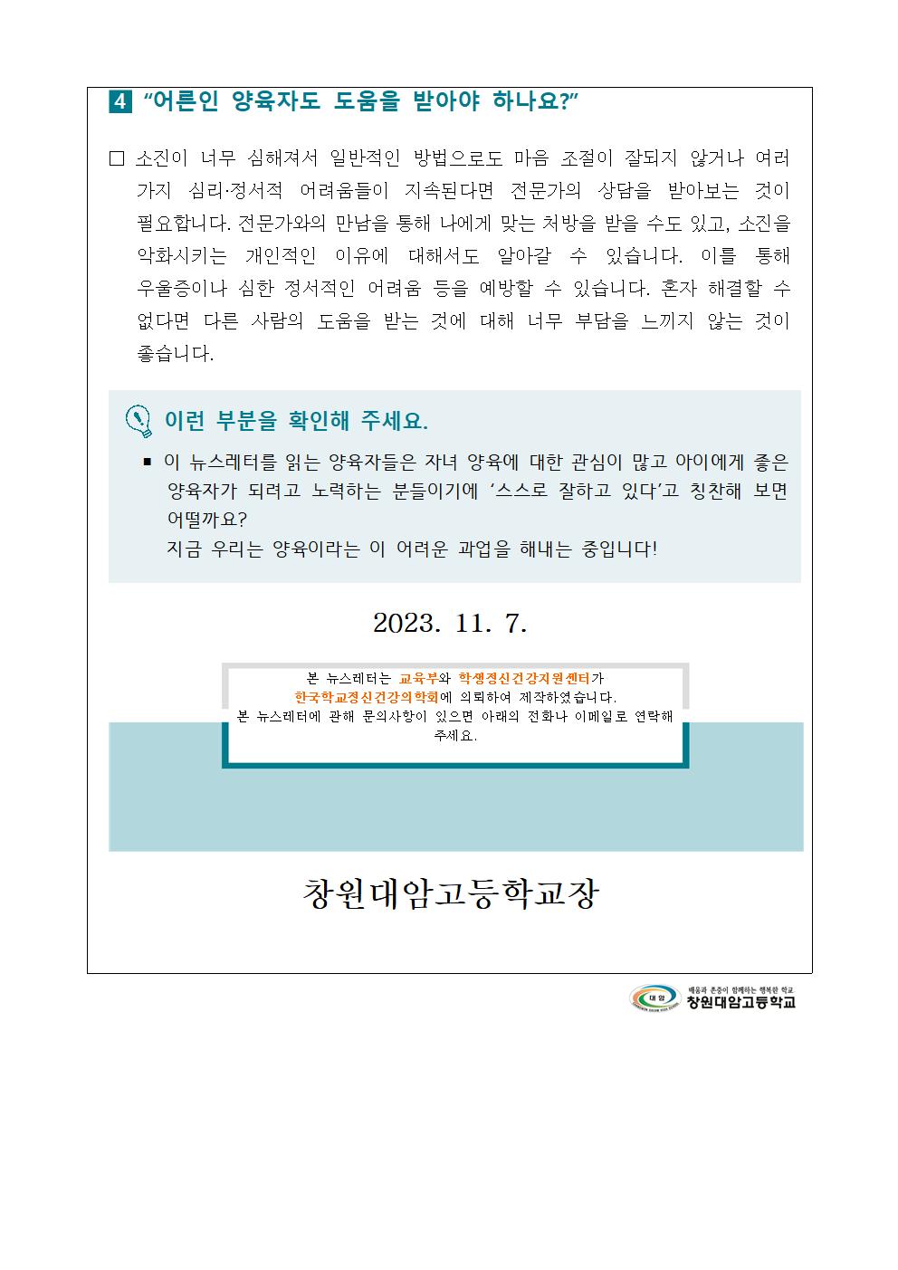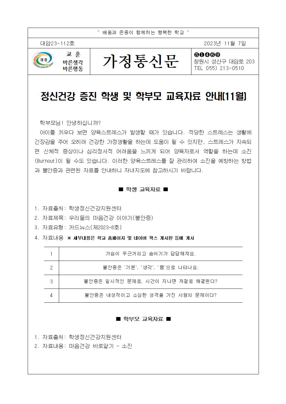 정신건강 증진 학생 및 학부모 교육자료 안내(11월)
