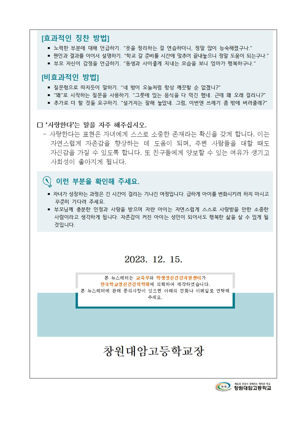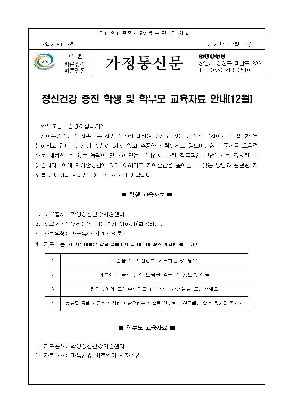 정신건강 증진 학생 및 학부모 교육자료 안내(12월)