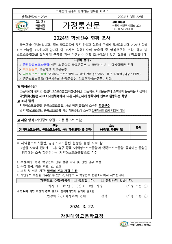 2024년 학생선수 현황 조사 가정통신문
