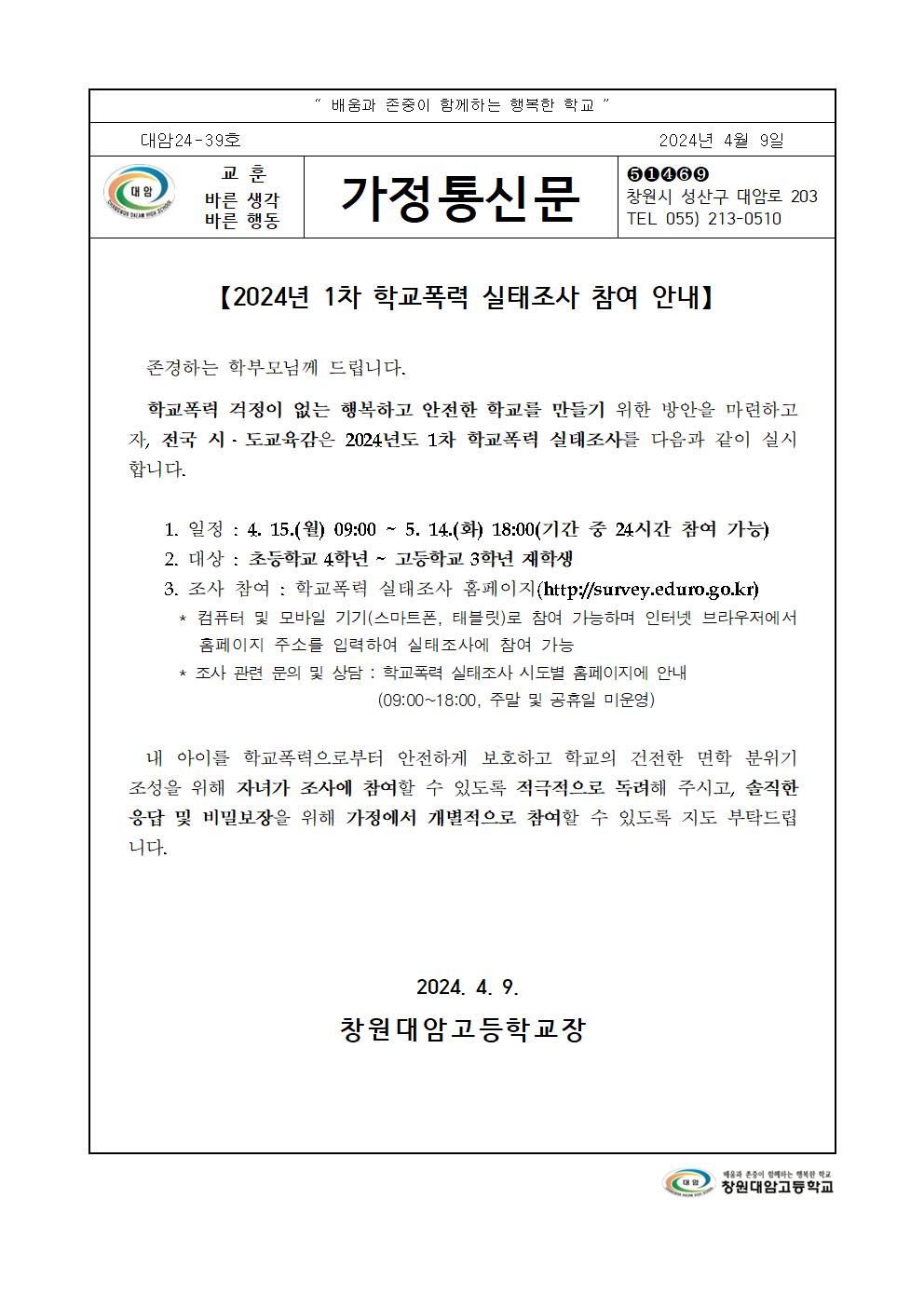 2024년 1차 학교폭력 실태조사 참여 안내 가정통신문