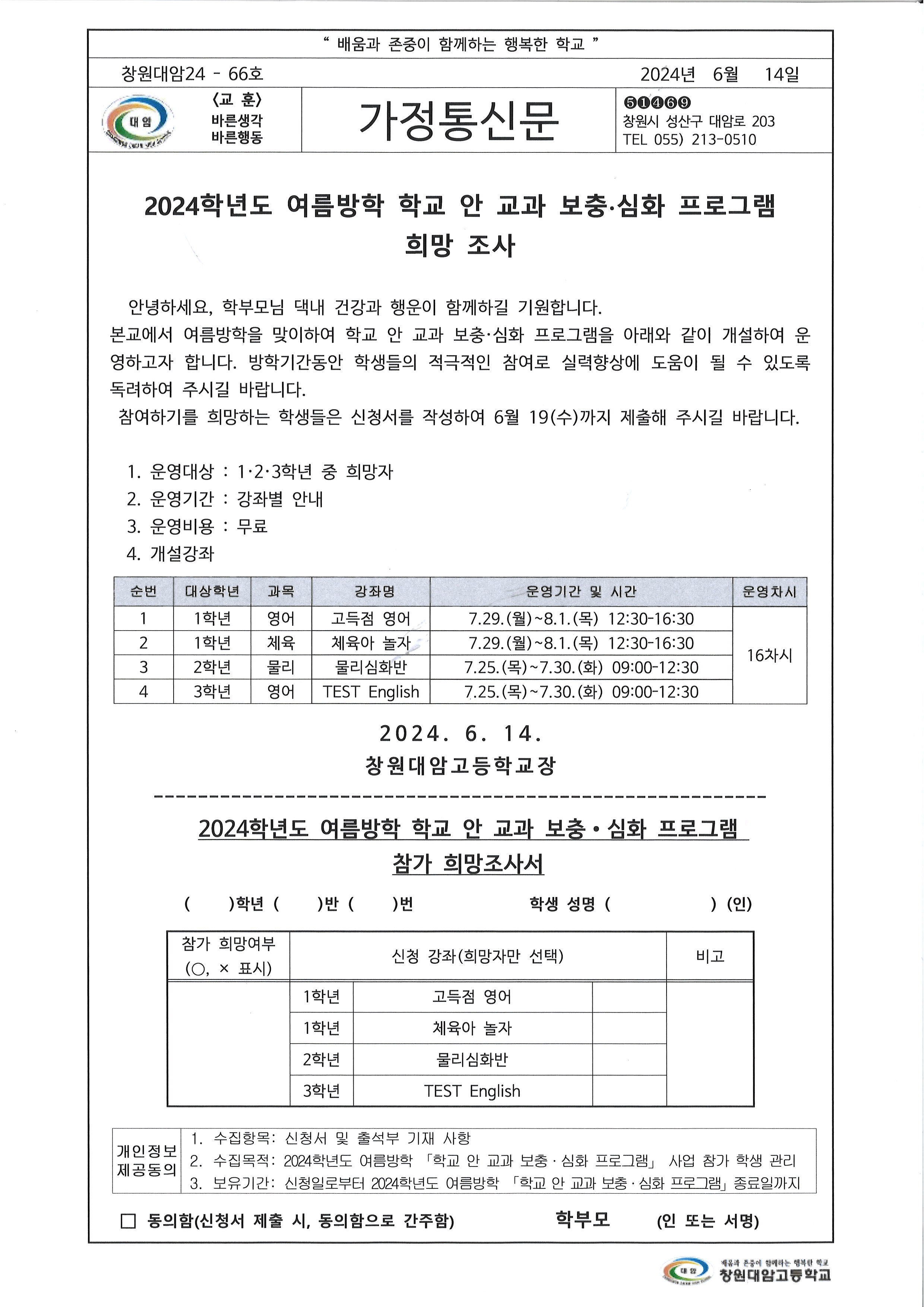 2024. 여름방학 학교 안 교과 보충심화 프로그램 참가 희망 조사