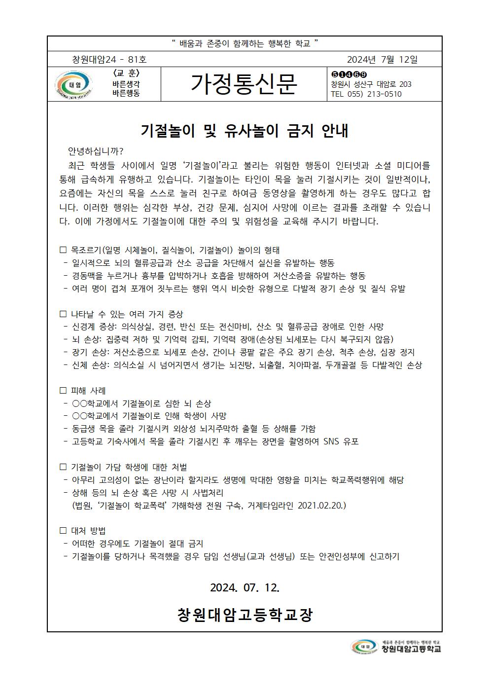 기절놀이 및 유사놀이 금지 안내