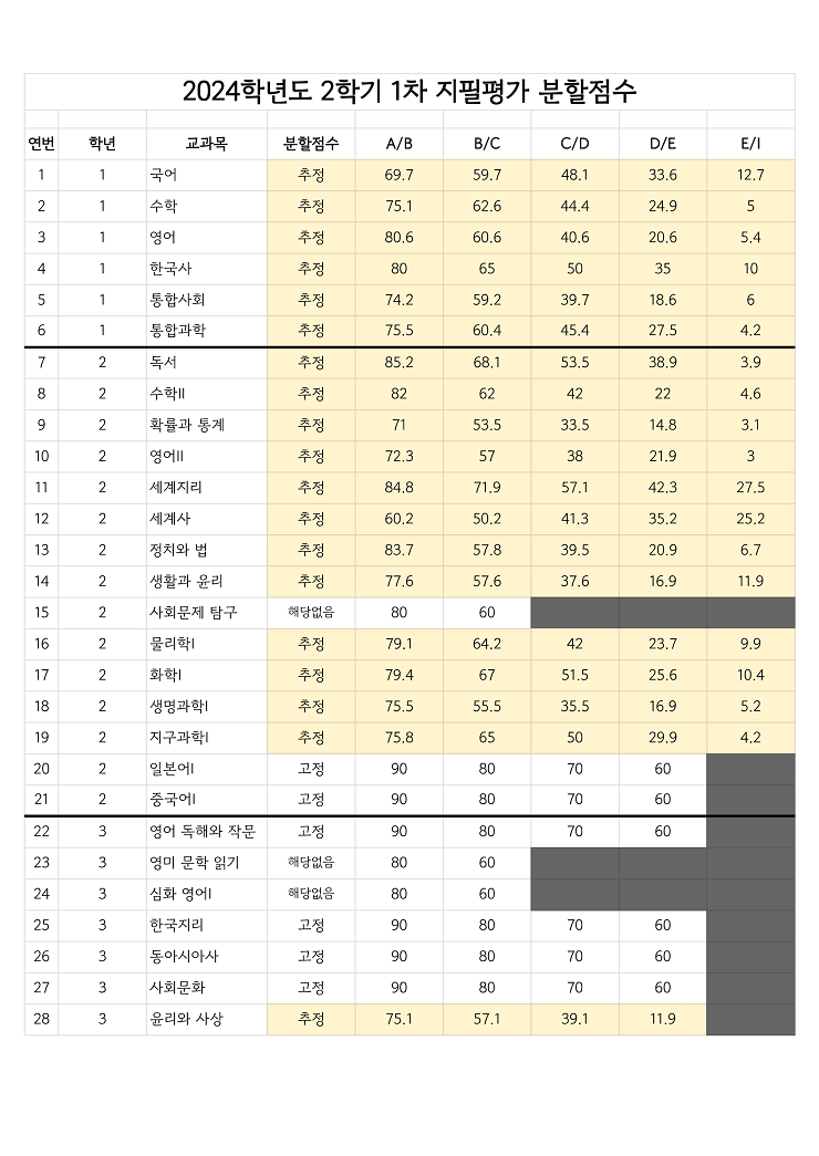 2024학년도 2학기 1차 지필평가 분할점수 안내