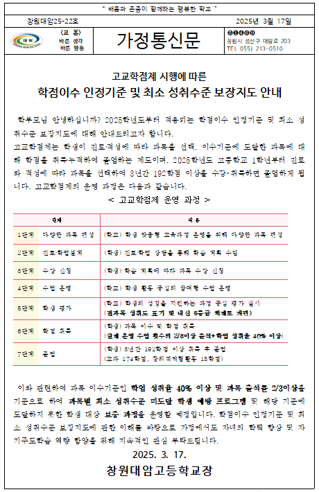 2025학년도 학점 이수 인정 기준 및 최소 성취수준 보장지도 안내 가정통신문입니다.