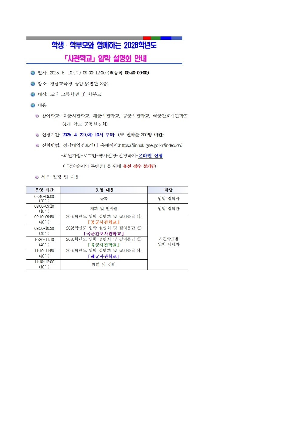 학생 학부모가 함께하는 2026학년도 사관학교 입학 설명회