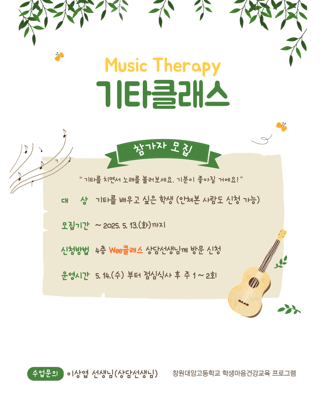 본교 Wee클래스에서 2025. 학생마음건강교육 음악치료 프로그램을 운영하오니 관심 있는 학생들은 신청하여 주시기 바랍니다.