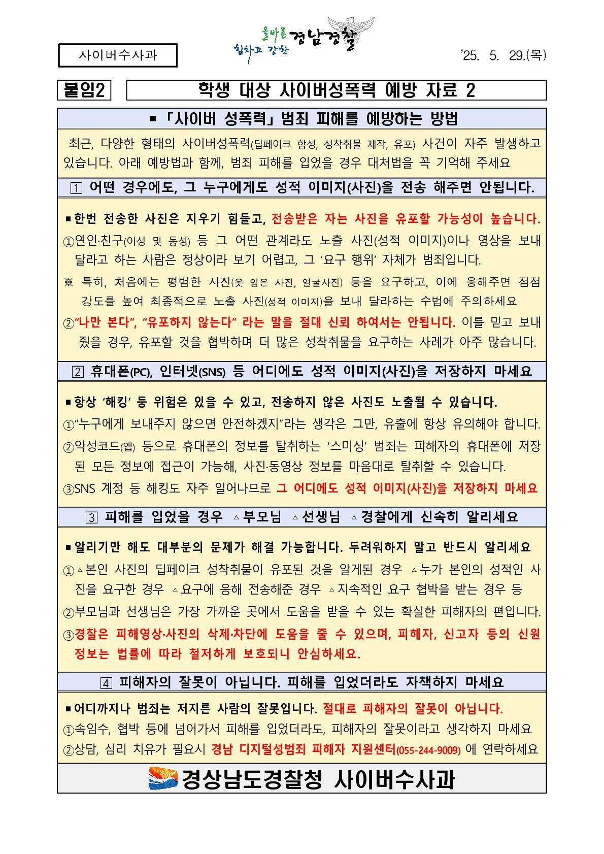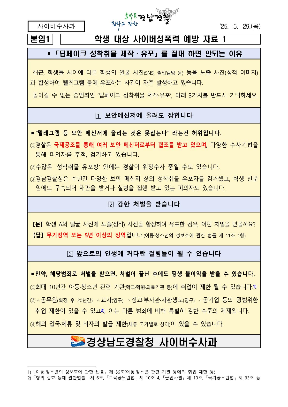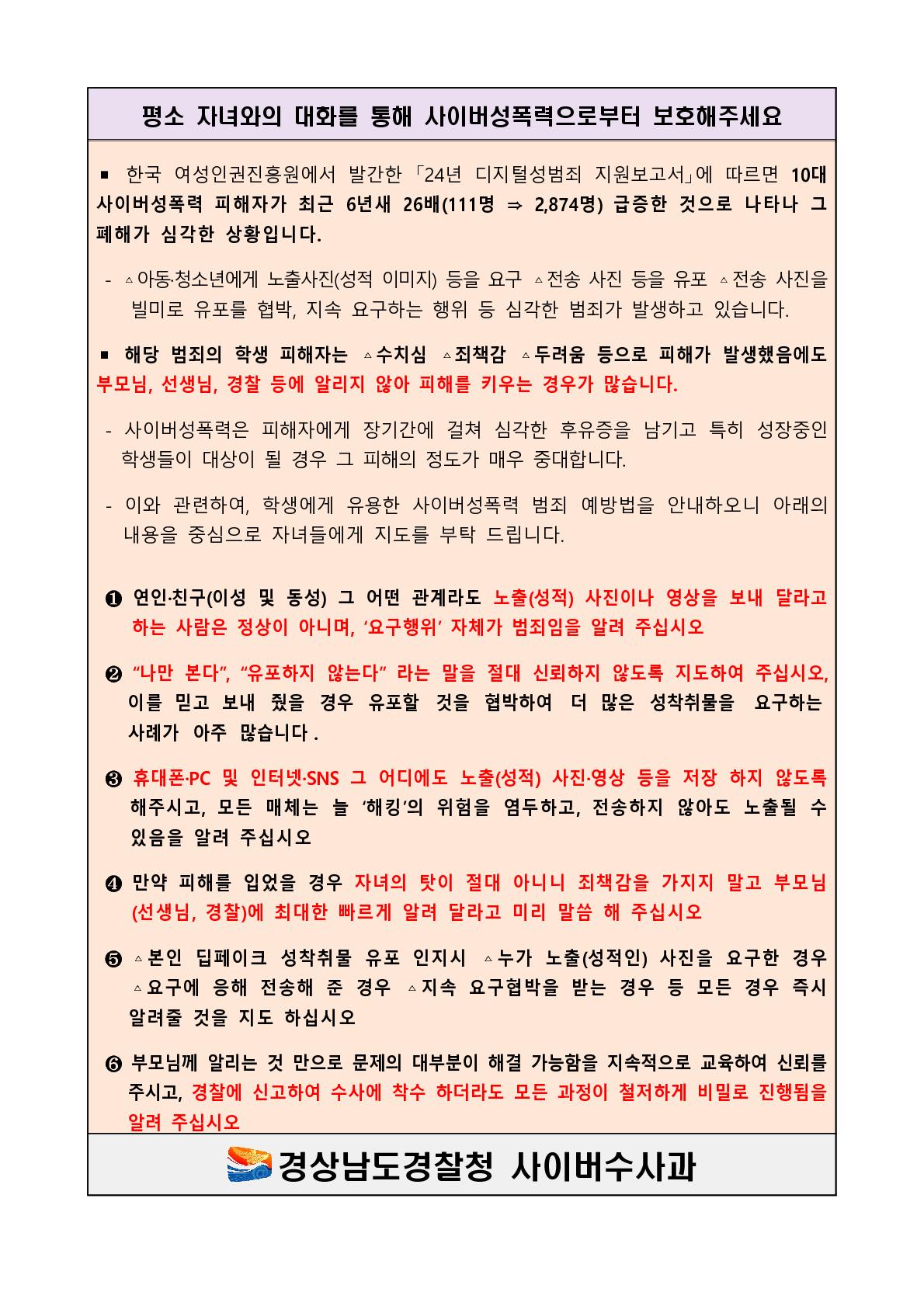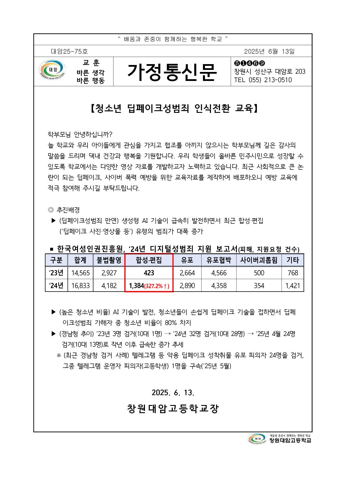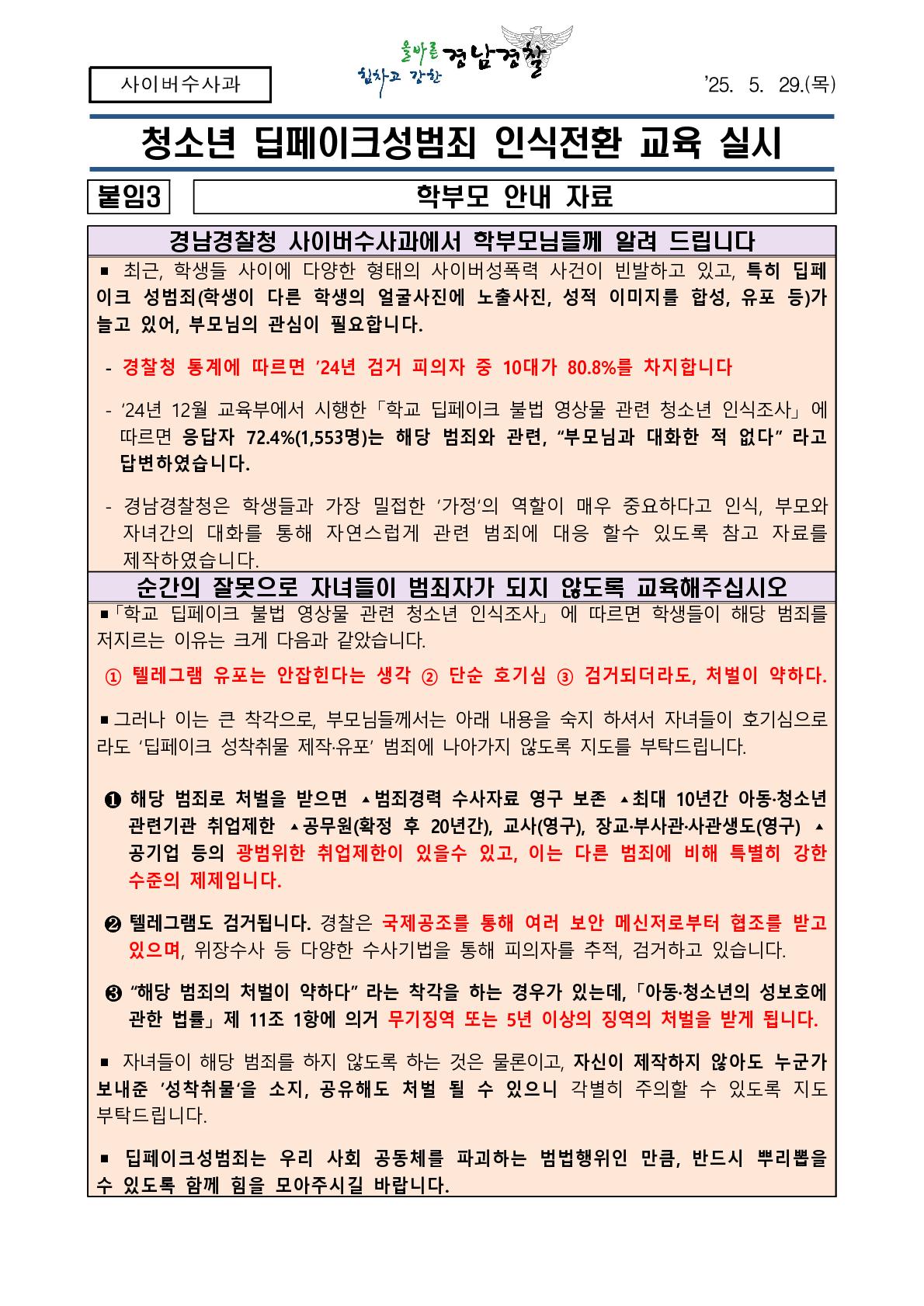 청소년 딥페이트성범죄 인식전환 교육 가정통신문