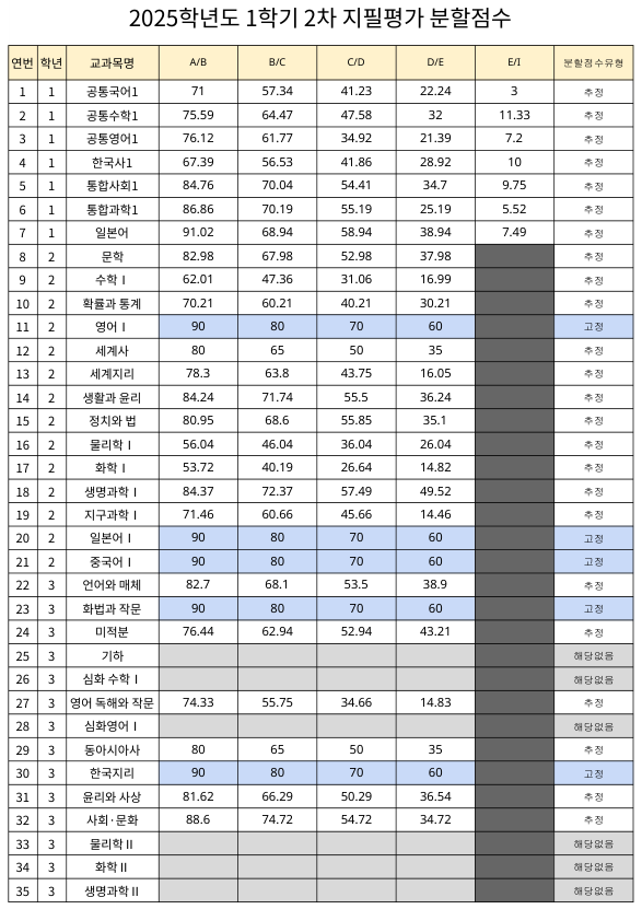 2025학년도 1학기 2차 지필평가 분할점수를 붙임파일과 같이 안내합니다.