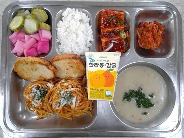 쌀밥(적은양) 양송이감자크림스프 (2.5.6.13.16)마늘빵 (2.5.6)두부구이양념조림 (5.6)한국식미트소스스파게티 (1.2.5.6.9.10.12.13.16)비트빛깔피클 (13)배추김치 (9)한라봉감귤주스 (13)