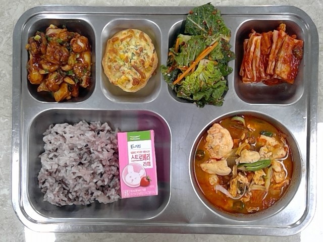 검정쌀밥 몽글몽글순두부찌개 (1.5.6.9.10.17.18)봄동겉절이 (5.6.13)숯불바베큐치킨 (5.15)수제하트콘치즈그라탕 (1.2.5.6.8.10.13.15.16)배추김치 (9)딸기라떼 (1.2)