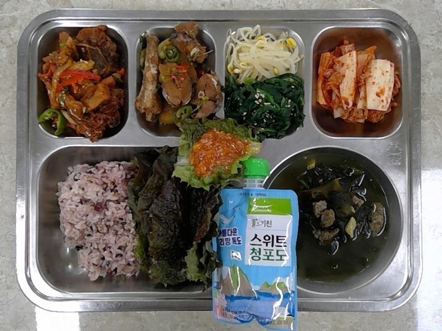 오곡찰밥 쇠고기대합미역국 (5.6.16.18)코다리매운맛양념조림 (5.6.13)삼색나물(무) (5.6)LA식돼지갈비구이 (5.6.10.13)배추김치 (9)스위트청포도 (13)상추쌈(자율) (5.6.13)