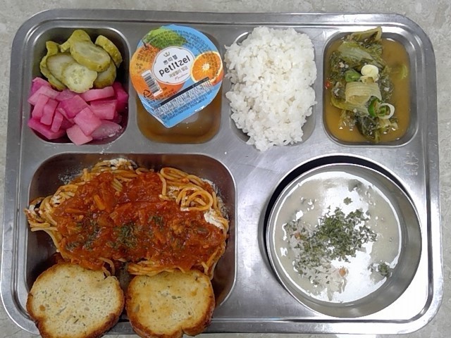쌀밥(적은양) 양송이감자크림스프 (2.5.6.13.16)마늘빵 (2.5.6)배추시래기조림 (5.6)한국식미트소스스파게티 (1.2.5.6.9.10.12.13.16)비트빛깔피클 (13)밀감푸딩