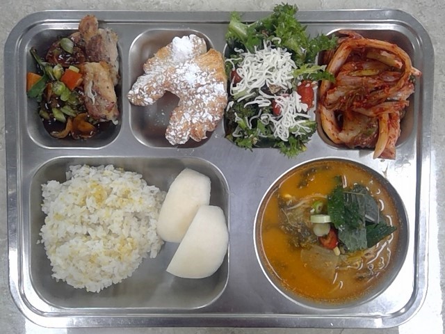 기장밥 사골우거지국 (5.9)치킨스테이크+감자구이 (1.2.5.6.12.13.15.16)구운채소샐러드 (2.12.13)직접담근배추김치 (9.13)아삭한배 플라워파이 (1.2.5.6)