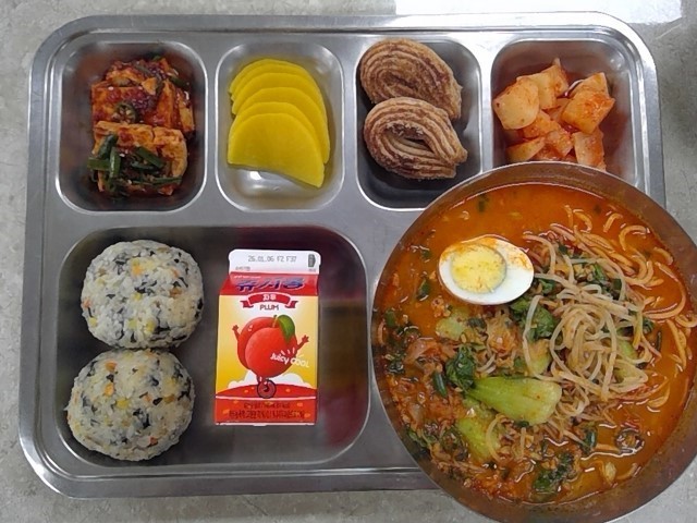 미니김가루야채주먹밥 탄탄면 (1.2.4.5.6.9.10.12.13.15.16.17.18)매콤한두부양념조림 (5.6.13)단무지 (13)깍두기 (9)자두맛쥬시쿨 (11.12)물방울츄러스 (1.2.5.6)