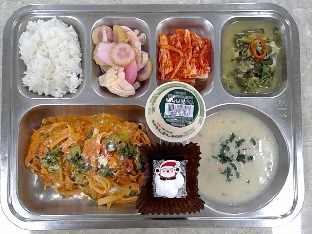 쌀밥(적은양) 양송이감자크림스프 (2.5.6.13.16)무시래기조림 (5.6.9.18)4색아삭피클 투움바파스타 (1.2.5.6.9.10.12.13.16)배추김치 (9)바나나맛우유 (2)스노우산타굴뚝케익 (1.2.5.6)