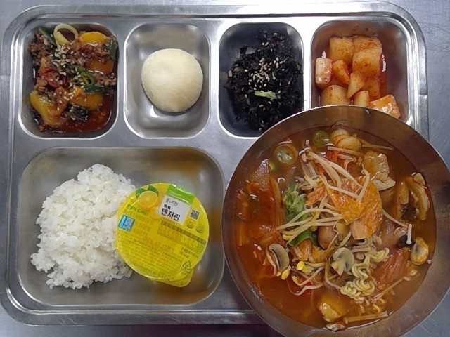 쌀밥 모듬햄부대찌개/ 라면사리 (1.2.5.6.9.10.15.16)중국식감자조림 (5.6.13.18)잔파김무침 (5.6)깍두기 (9)찰치즈볼오븐구이 (1.2.5.6)톡톡감귤주스 (13)