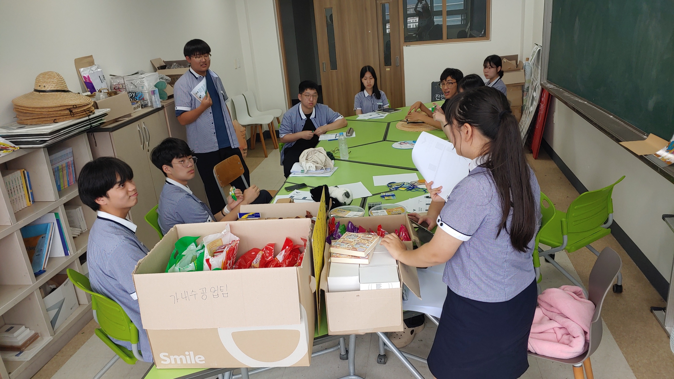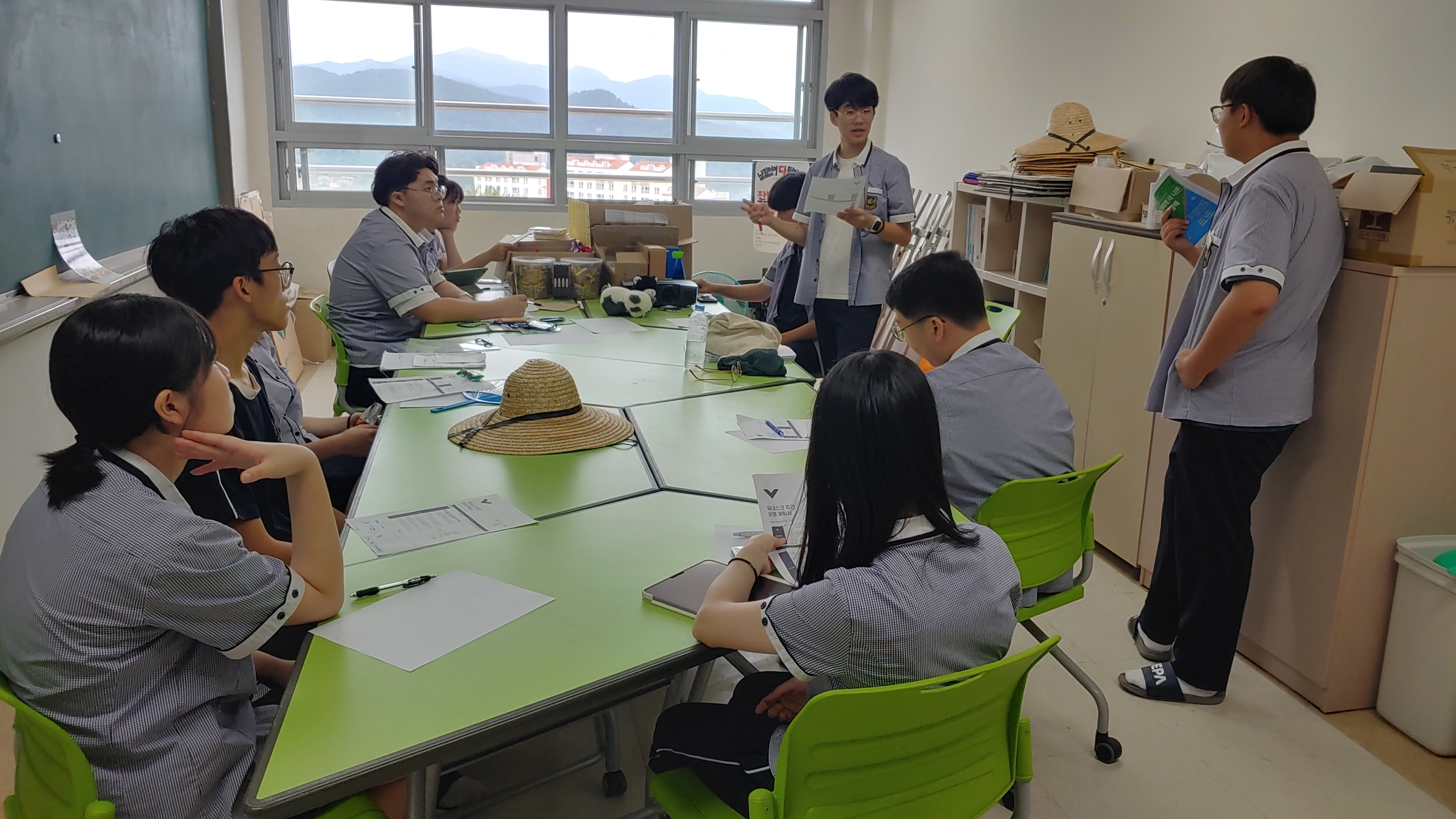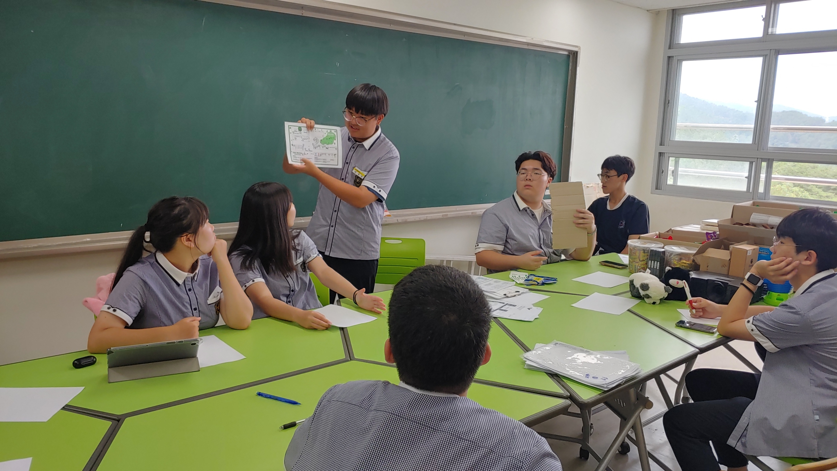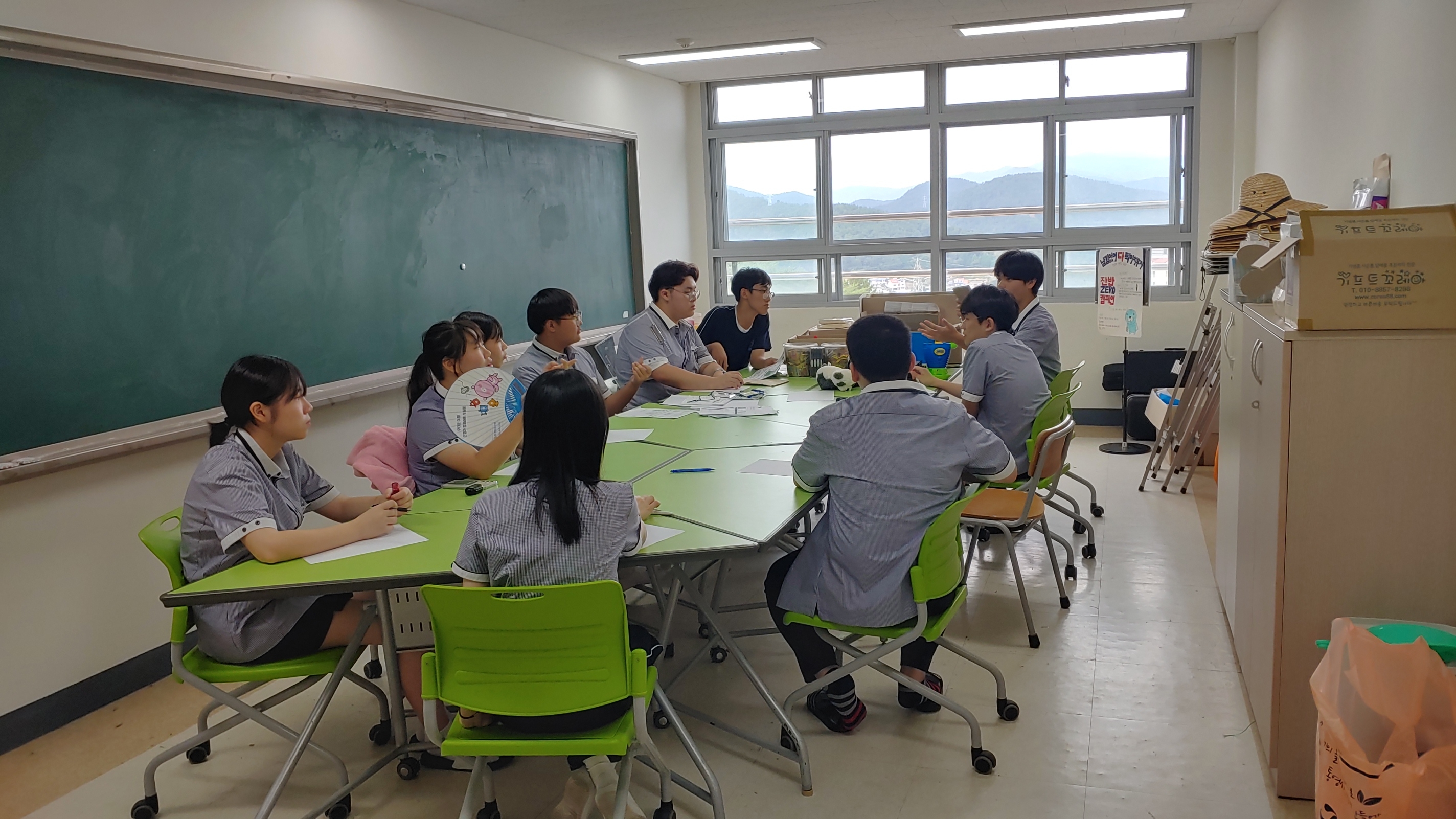 수요 동아리 시간에유네스코 동아리 가내수공업 동아리원들이 운영 주측이 되는 2023년 동원고 지속가능주간을 위해 첫 활동별 전체 브리핑을 하고 서로 피드백을 하고 있다. 동시에 통영행복교육지구에서 학교지원사업 현장점검이 있었다.