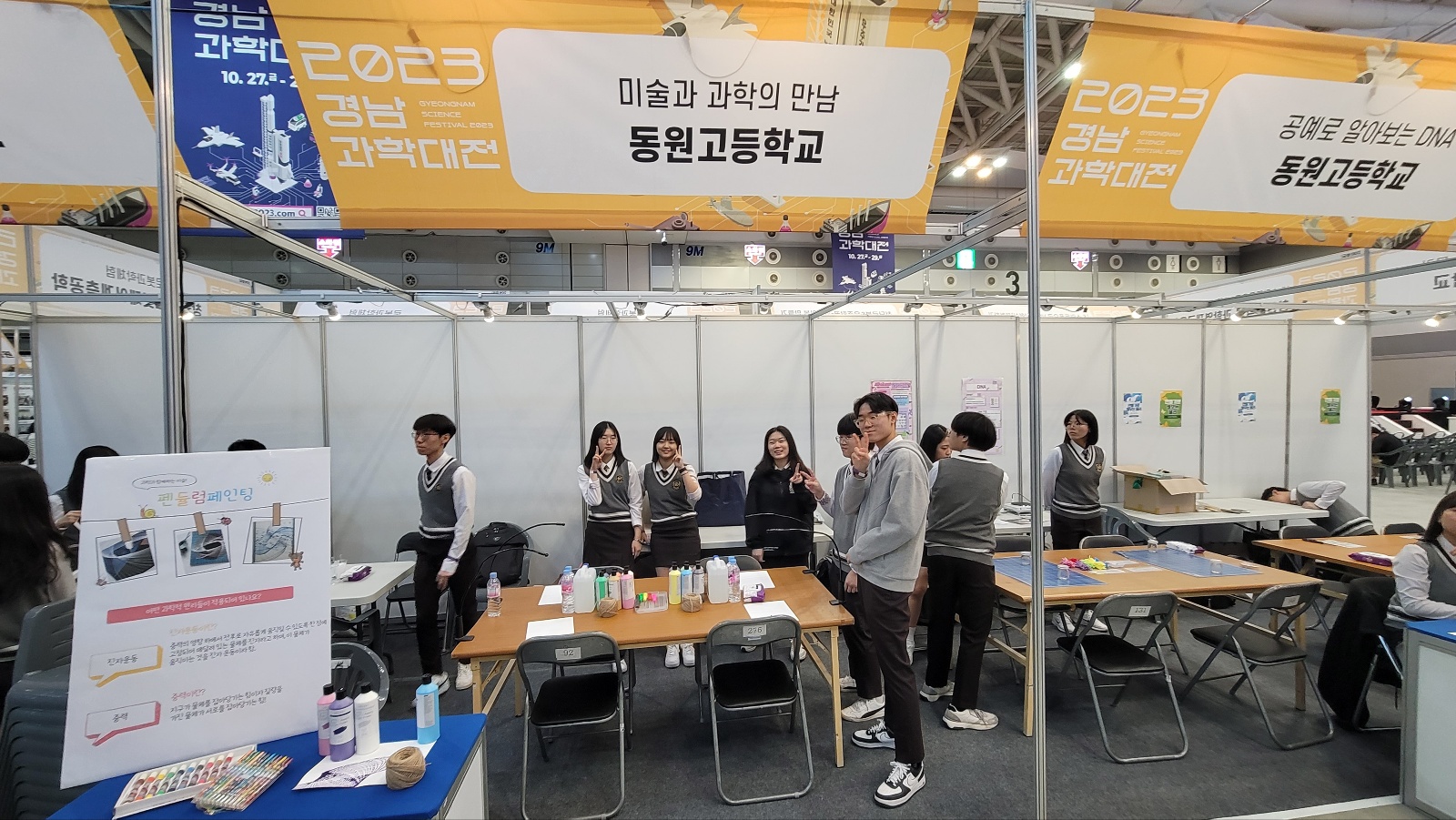 동원고, 2023 경남과학대전 참가 -다양한 체험 부스 운영- 동원고등학교(교장 지창근)는 지난 10월 27일에서 29일까지 3일 동안 경남과학대전 부스 운영을 진행했다. 1,2 학년 39명의 학생이 참여한 경남과학대전에서는 4개의 부스를 운영하여 다양한 프로그램들이 진행하며 학생들의 열정을 확인할 수 있는 뜻 깊은 시간을 가졌다. 동원고는 경남의 일반계 고등학교 중 유일하게 경남과학대전에서 부스를 운영할 기회를 얻어 ‘미술과 과학의 만남’, ‘미리 크리스마스’, ‘공예로 알아보는 DNA’, ‘만들기로 배우는 물리’ 등 총 4개의 주제를 부스별로 각각 운영하였다. 학생들이 ‘DNA 팔찌 만들기’, ‘DNA캔들 만들기’, ‘루돌프 손난로 만들기’. ‘스노우볼 만들기’, ‘아나모르포시스’, ‘펜듈럼페인팅’, ‘고래피리 만들기’, ‘고무동력 나비만들기’ 등 다양한 부스활동을 통해 다양한 방문객들과 소통하며 공동체 역량을 함양하는 좋은 기회가 되었다고 한다. 동원고 2학년 손○○ 학생은 다양한 부스 운영 경험이 교과 시간 학습한 내용을 간단한 체험의 형태로 녹여내어 실험 수행 능력 및 과학적 탐구력을 신장하고, 다양한 사람들과 소통을 할 수 있는 뜻 깊은 경험이 되었다고 말했다. 경남과학대전에 참가하여 과학 중점학교 관련 부스 운영과 관련된 체험활동의 시간이 앞으로 학교생활과 진로 선택에 긍정적인 영향을 미칠 것을 기대한다.