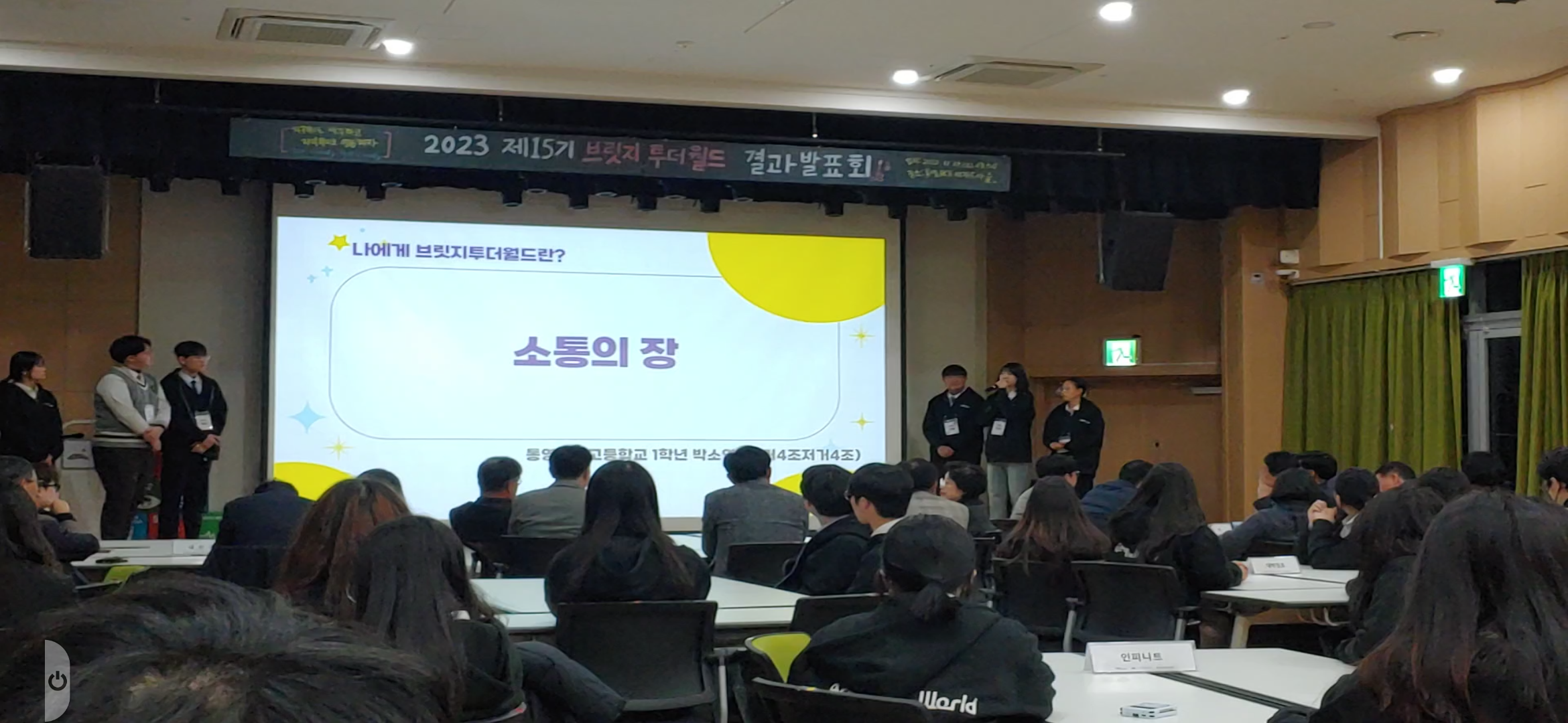 통영 RCE세자트라에서 주최하는 15기 브릿지투더월드 프로젝트에 참여한 동원고18명의 학생중에서 8명은 오늘 2023.11.18 (토) 한마당 결과나눔에서 통영의 청소년 문제해결의 팀별 프로젝트 운영자로서 통영시민과 나누는 시간을 가졌고 국내탐방과 해외탐방의 결과 발표 또한 있었다.