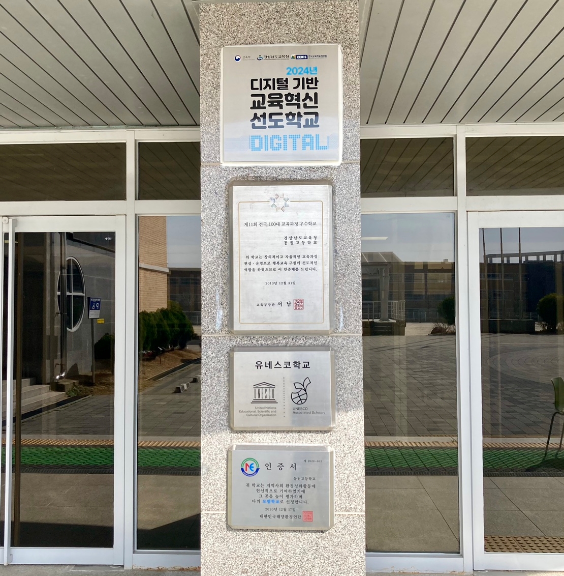 동원고, 디지털 기반 교육혁신 선도학교 선정 ―경남 지역 고등학교 13개 디지털 선도학교 중 하나로 지정되어 예산 7천만 원 지원― 동원고등학교(교장 지창근)는 3월 15일(금) 현관에서 <디지털 기반 교육혁신 선도학교>의 현판을 설치하며 디지털 선도학교의 운영을 시작하였다. 동원고등학교는 지난 12월에 학교 공동체의 의견을 수렴하여 찬성율 65.3%로 디지털 선도학교 공모에 지원하였고, 지난 2월에 경상남도교육청으로부터 경남 지역 고등학교 13개 디지털 선도학교 중 하나로 지정되어, 7천만 원의 예산을 배정받았다. 동원고등학교는 2012년 신축 학사 이전 당시부터 교실마다 전자칠판을 설치하였고, 23년 10월에 모든 교실의 전자칠판을 최신형으로 교체하여 학교 구성원이 참여형 스마트 교육에 익숙한 상태이다. 동원고등학교는 지속적으로 개발되어 온 디지털 교육 운용에 대한 역량을 점차 다양한 교과로 확산하고 수업 모델을 다양화할 수 있도록 교육적 지원을 하고, 교사들이 학습자 수요 중심 교수 설계자나 콘텐츠 생산자로 변모할 수 있도록 지원할 예정이다. 이를 위해 AI 코스웨어를 활용한 프로그래밍 개념 강의 및 예제 설명과 AI 코스웨어의 기능을 바탕으로 협동 학습을 진행하며 교수·학습을 개선할 예정이다. 또한 AI 코스웨어를 활용한 교사의 역할 변화를 통해 학생 이해와 관찰에 기반한 교수 설계자로서의 교사와 정서적 지지자로서의 교사로 변화하고, 이를 통해 사교육을 경감하고 학생들의 기초 학력을 제고할 뿐 아니라 교원의 행정 업무를 경감하고 교수·학습 연구 시간을 확보하는 효과를 기대하고 있다. 지창근 교장은 “AI 코스웨어 운용을 통해 2025학년도 AI 디지털 교과서 도입 및 운영의 기틀을 마련하고 AI 코스웨어 사용 수업을 확대하고 운영 성과를 공유하여 교내 구성원의 지식정보처리 역량 및 디지털·AI 리터러시 역량을 함양하는 계기가 되자”고 강조하며 교과, 정보, 타인을 연결하고 소통하는 시대를 주도할 인재가 되기를 역설하였다.