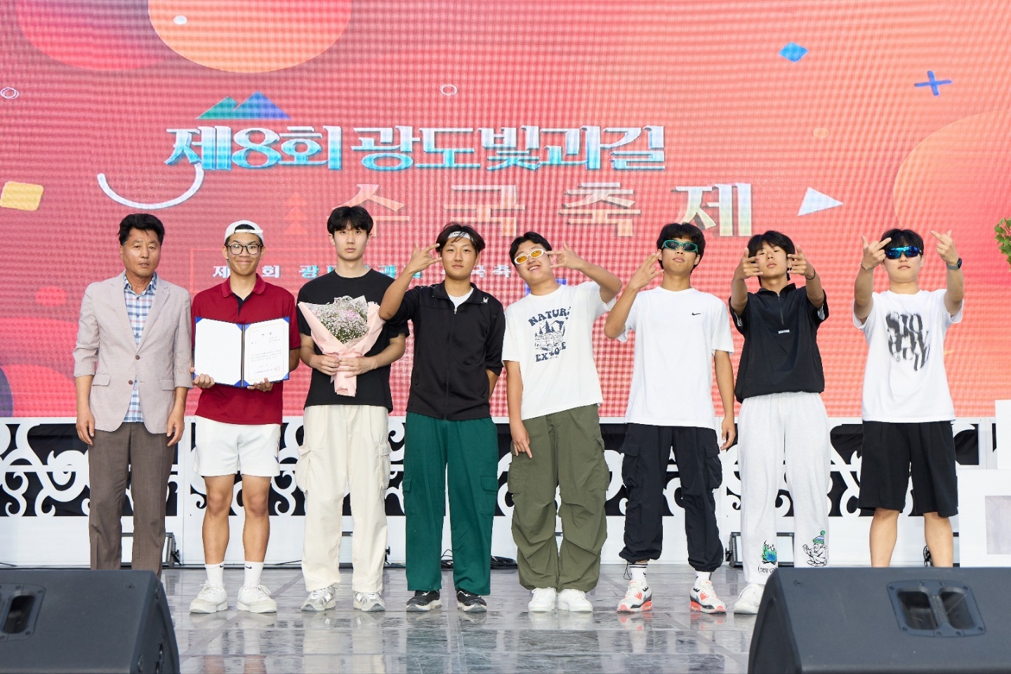 지난 6월 15일(토) 광도면 빛길 수국축제 청소년 가요제에 참가한 본교 학생들이 영예의 대상과 금상을 각각 수상하였습니다. 동원고 학생들은 화려하게 핀 수국 꽃을 보러 온 많은 시민들 앞에서 숨겨진 끼를 마음껏 뽐냈고, 총 9팀의 참가자들 중에 대상과 금상을 차지해 상장과 상금을 받았습니다. 이날 행사에서 대상은 화려하고도 파워풀한 댄스를 선보인 2학년 김도현, 최민기, 편장혁, 윤강찬, 김태빈, 하동현, 조민준 학생이 금상은 뛰어난 가창력을 뽐낸 2학년 김예린, 김우주 학생이 차지했습니다. 고등학교 시절 잊지 못할 추억을 만들고 싶어 참가했다고 참가 동기를 밝힌 학생들은 오히려 많은 관람객들에게 즐거운 기억 하나 선물해 드렸습니다.