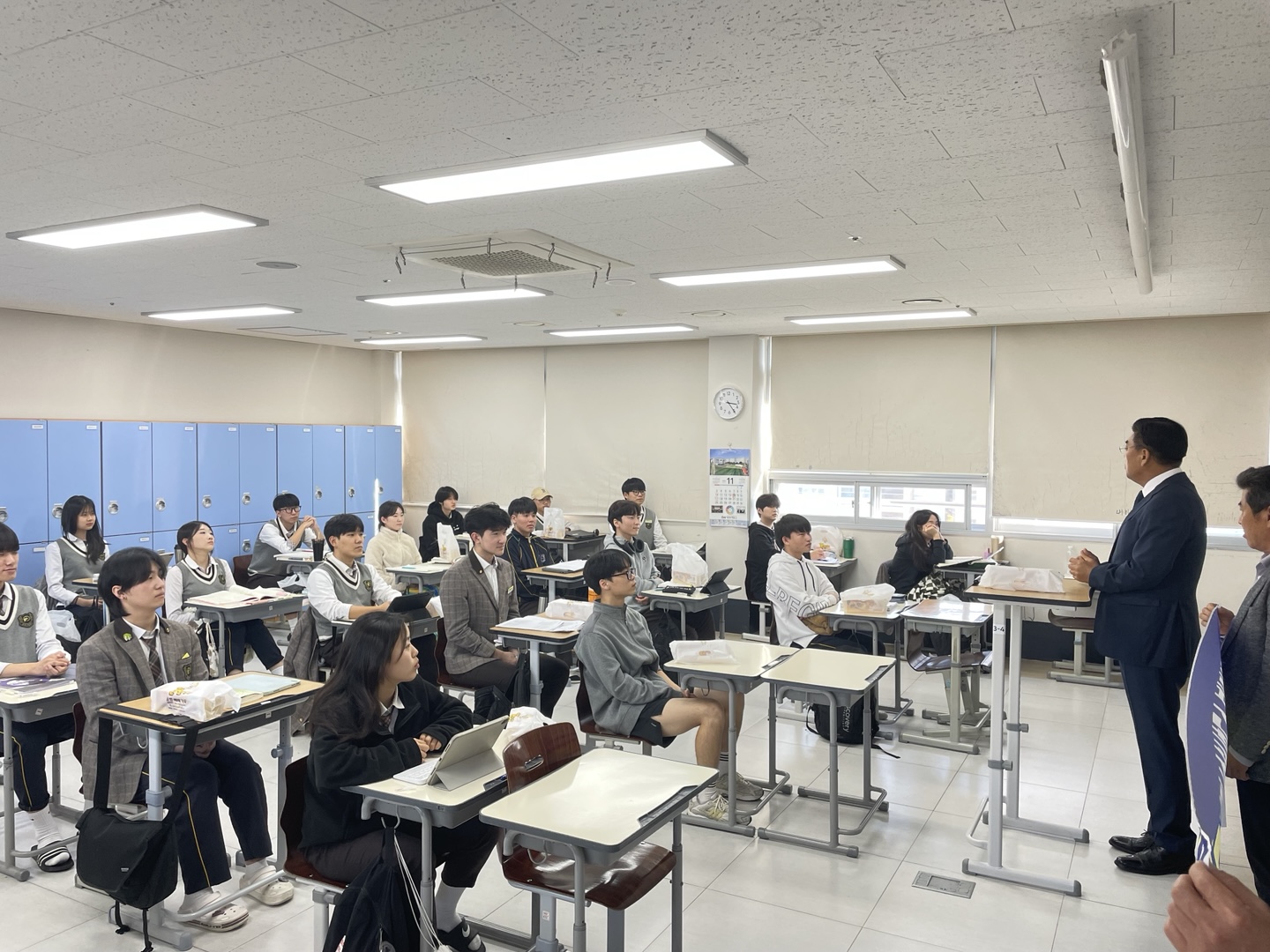 본교의 최정우 총동창회장님, 조정철 총동창회사무총장님, 장희철 총동창회사무국장님께서 대표로 방문하여 3학년 학생들에게 격려와 함께 동문의 유년시절의 경험을 공유하는 뜻깊은 시간이였습니다. 선배 동문과 후배 동문이 함께 의지를 다지고 화이팅하는 모습이 특히 인상적이였습니다.