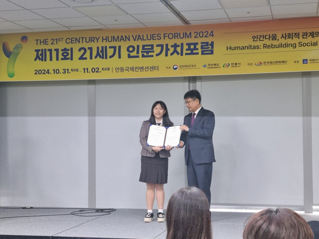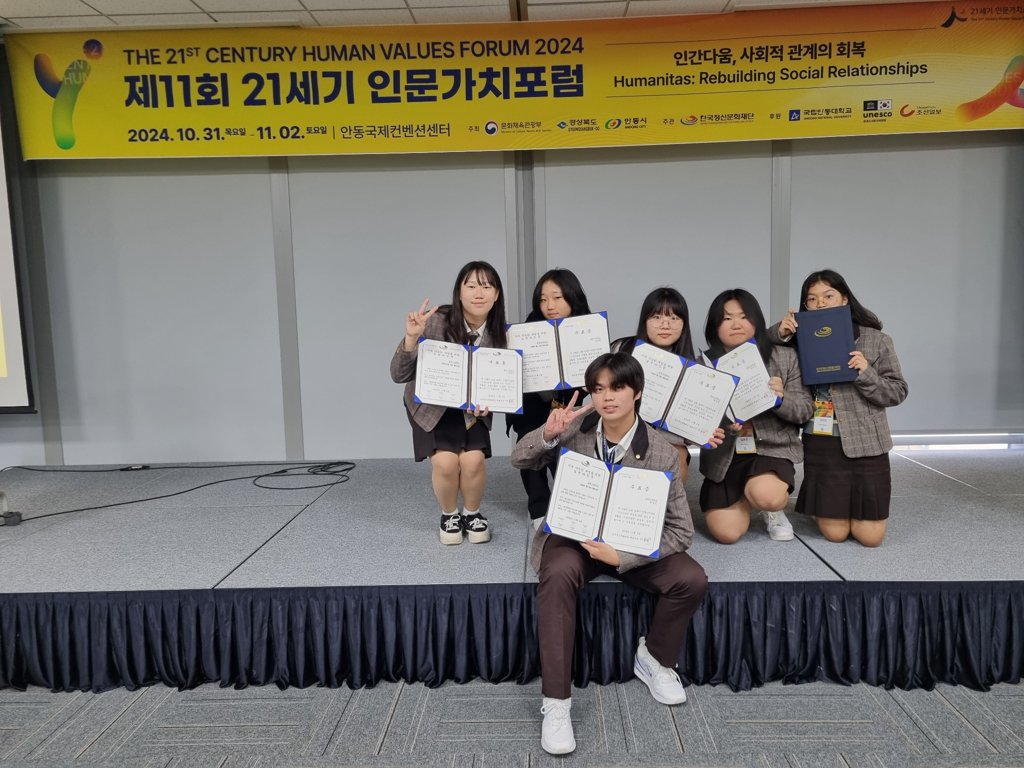 동원고등학교(교장 지창근)는 지난 2일 경북 안동의 안동국제컨벤션센터에서 개최된 '제11회 21세기 인문가치포럼'에 크리에이티브 스튜디오 동아리가 ‘지속가능한 내일을 위한 청소년 인문 활동’에 참여했다. 제11회 21세기 인문가치포럼은 ‘인간다움, 사회적 관계의 회복’을 주제로 지난달 31일부터 경북 안동에서 진행됐다.
