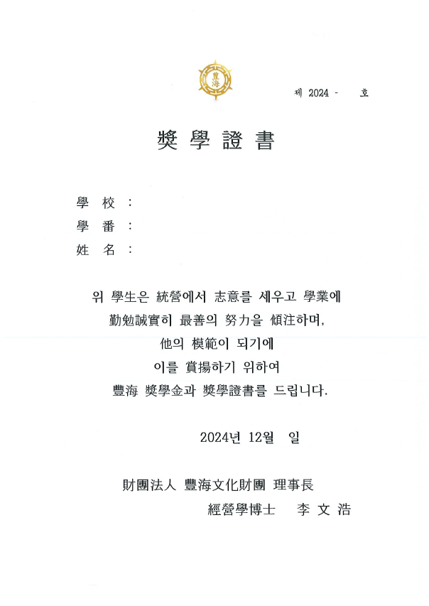 매년 큰 장학금을 지원해 주시는 풍해문화재단 이사장님께 깊이 감사드립니다.