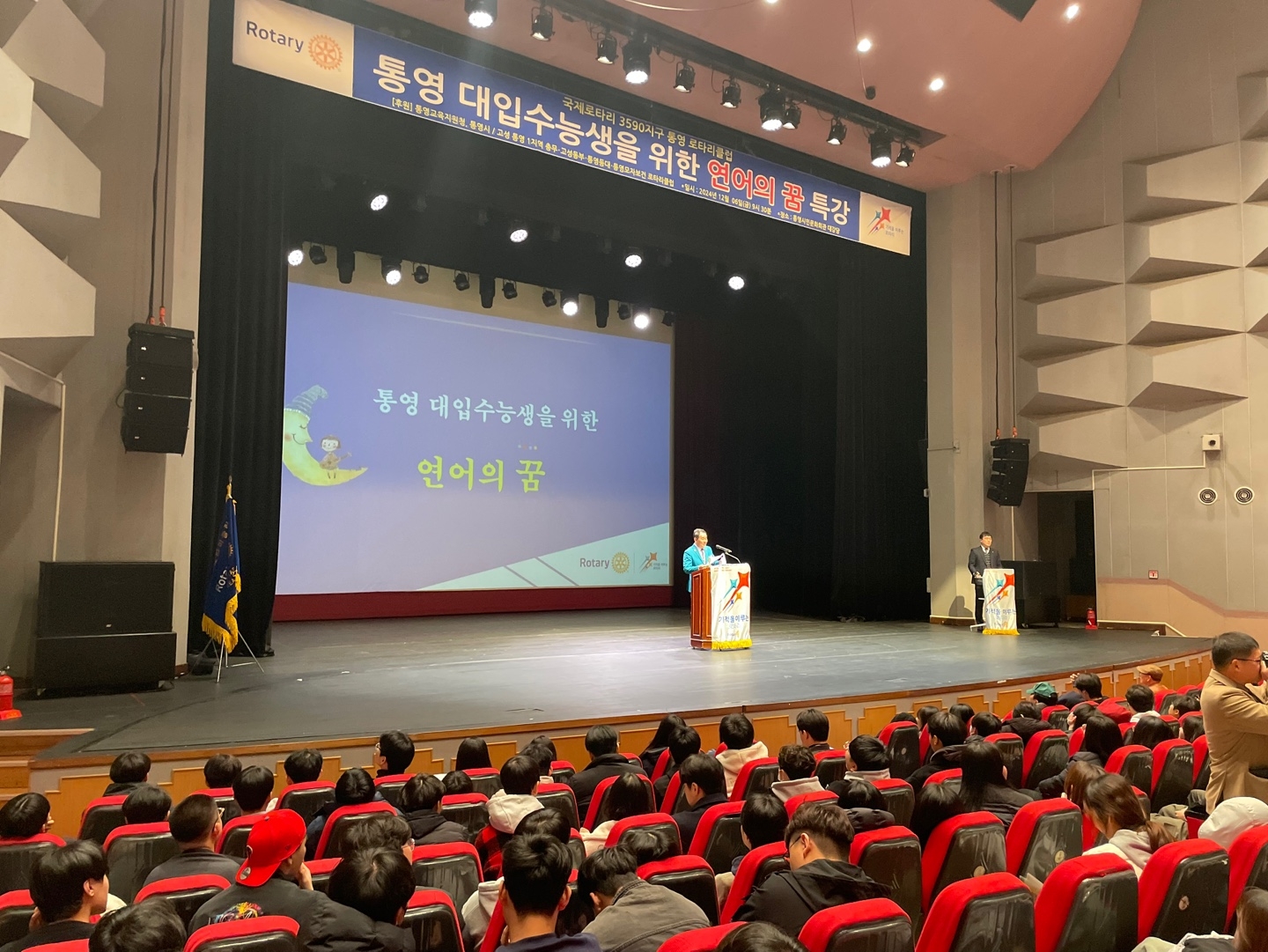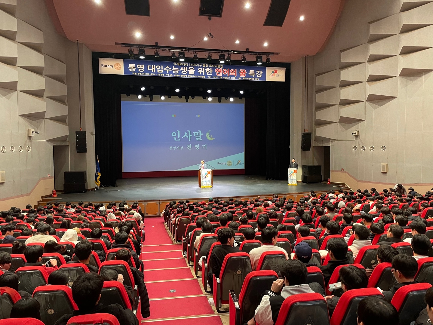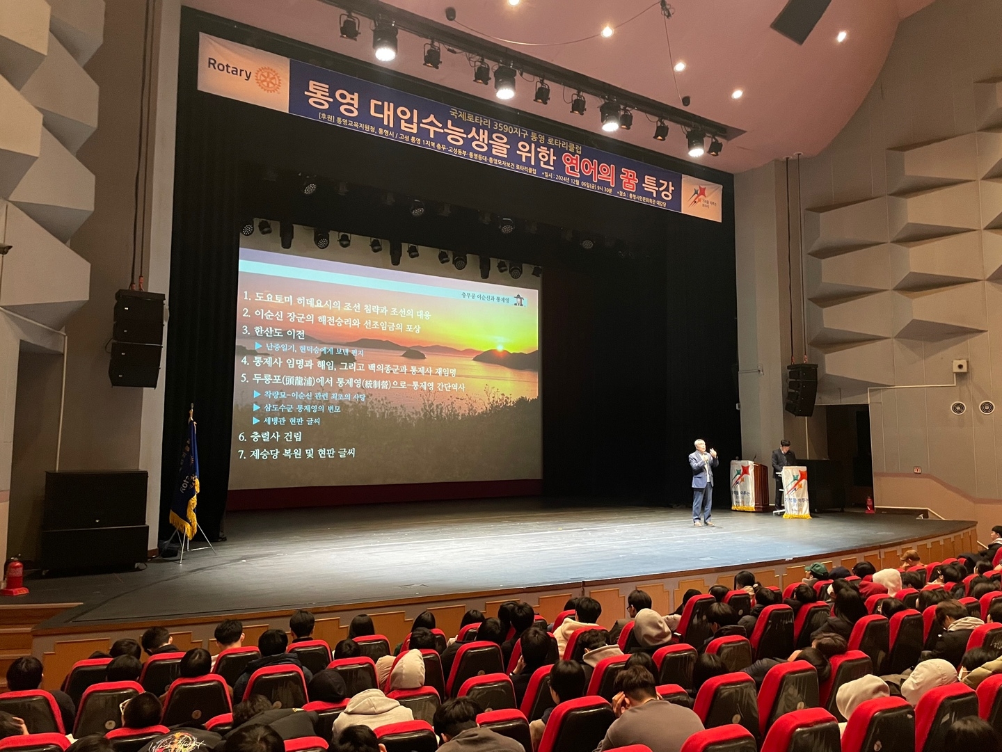 국제로타리 3590지구 토영로타리클럽에서 2025학년도 대학수학능력시험을 치른 통영시 고등학생을 대상으로 300년 통제영 문 화와 예술의 혼이 살아 숨 쉬는 고장 통영의 역사와 문화 예술에 대한 학습의 기회를 제공하는 통영 4강의에 참여하였습니다.