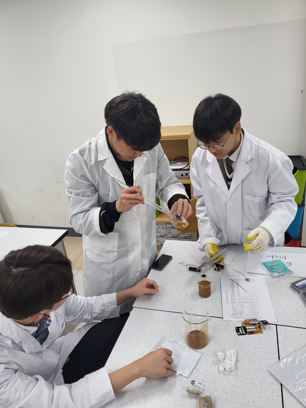 2025. STEAM형 프로젝트 청출어람 4월 운영 주간 가. 대상: 1, 2, 3학년 대상 학생 65명 나. 일시: 2025.4.15.(화) 18:30~20:30 다. 장소: 4층 물리실, 화학실, 생명과학실 라. 내용 - 실험 물품을 확인하고, 실험 물품을 분류함. - 시약장의 화학약품과 냉장고의 재료를 확인하고 정리함. - 실험을 설계한 내용을 바탕으로 기초실험을 진행함. - 과학실의 실험기기를 파악하고, 실험기기를 사용하는 방법을 익힘. - 실험 과정에 대한 피드백을 통해 실험 방법을 수정하고 추가로 필요한 물품을 탐색함. - 실험 및 탐구의 전 과정을 컨설팅하여 관심 분야에 대한 다양한 사고와 시각을 넓힘.
