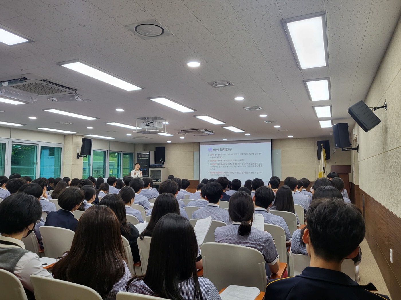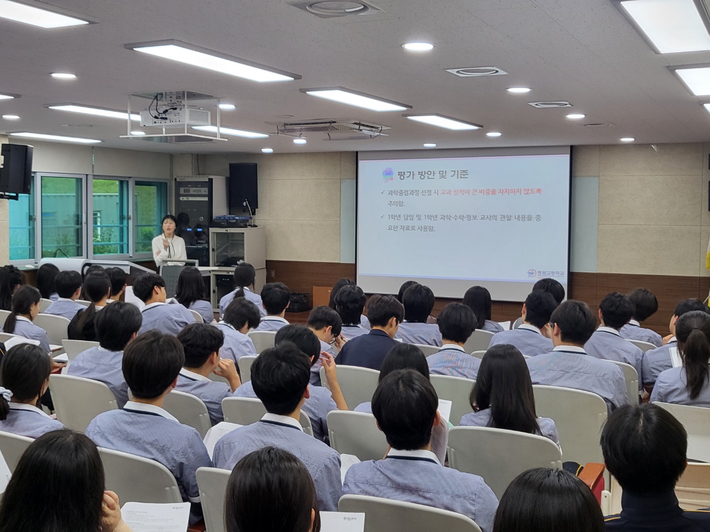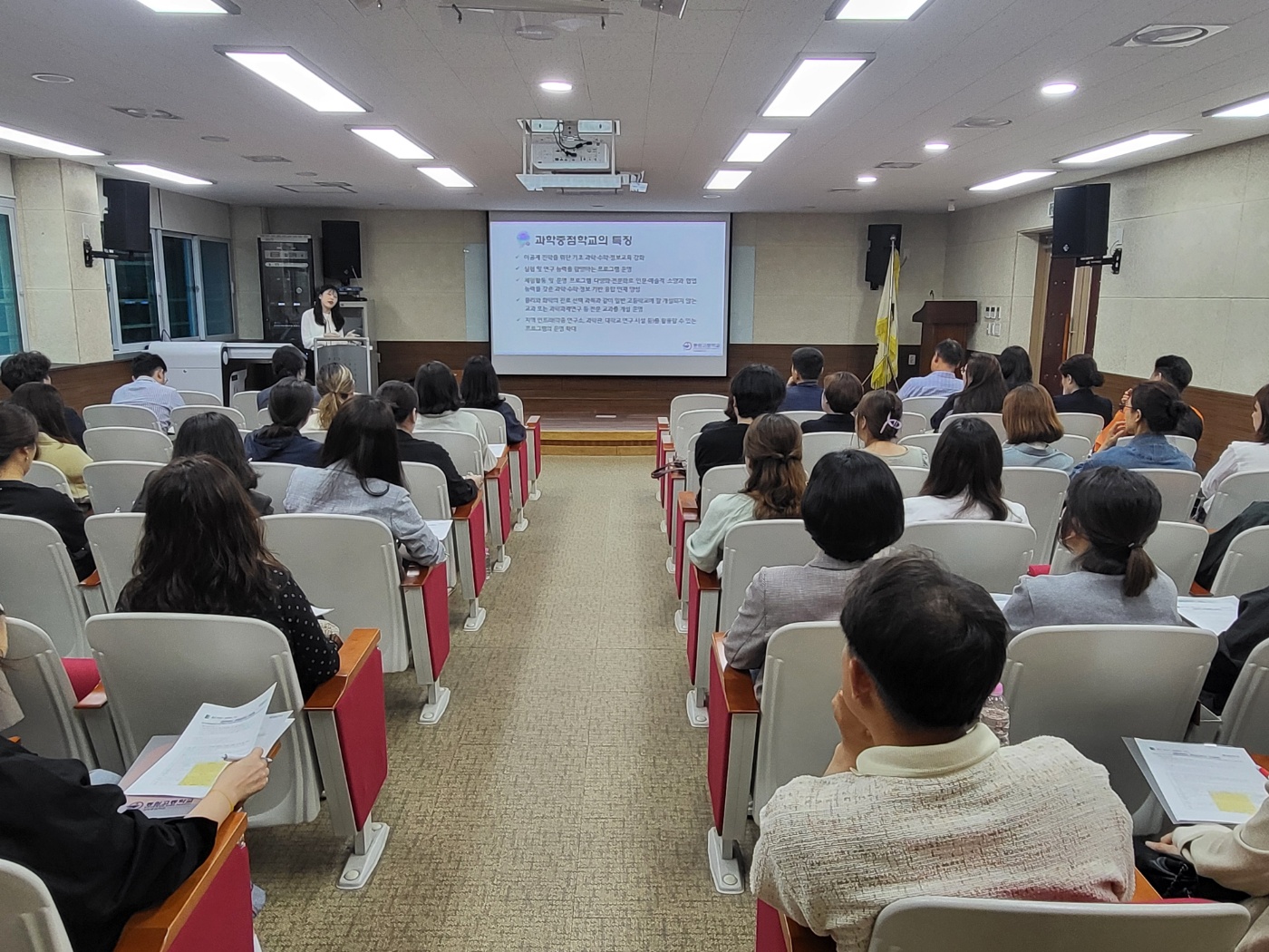 과학중점학교 설명회를 통해 과학중점학교와 과학중점과정에 대한 올바른 정보를 제공하여 학생과 학부모님의 충분한 이해를 바탕으로 바람직한 진로 선택을 돕고자 하였습니다. 과학중점학교와 과학중점과정에 대한 안내와 함께 본교의 과학중점 특색 프로그램에 대한 설명도 드리고, 과학중점과정에 대한 학생들과 학부모님들의 궁금함도 해결해드릴 수 있었습니다. 앞으로 객관적이고 공정한 선정 과정을 통해 이공계 계열에 관심과 열정이 있는 학생들을 과학중점과정 학생으로 선정하여, 이공계 핵심역량을 갖춘 창의융합인재로 성장시키겠습니다.