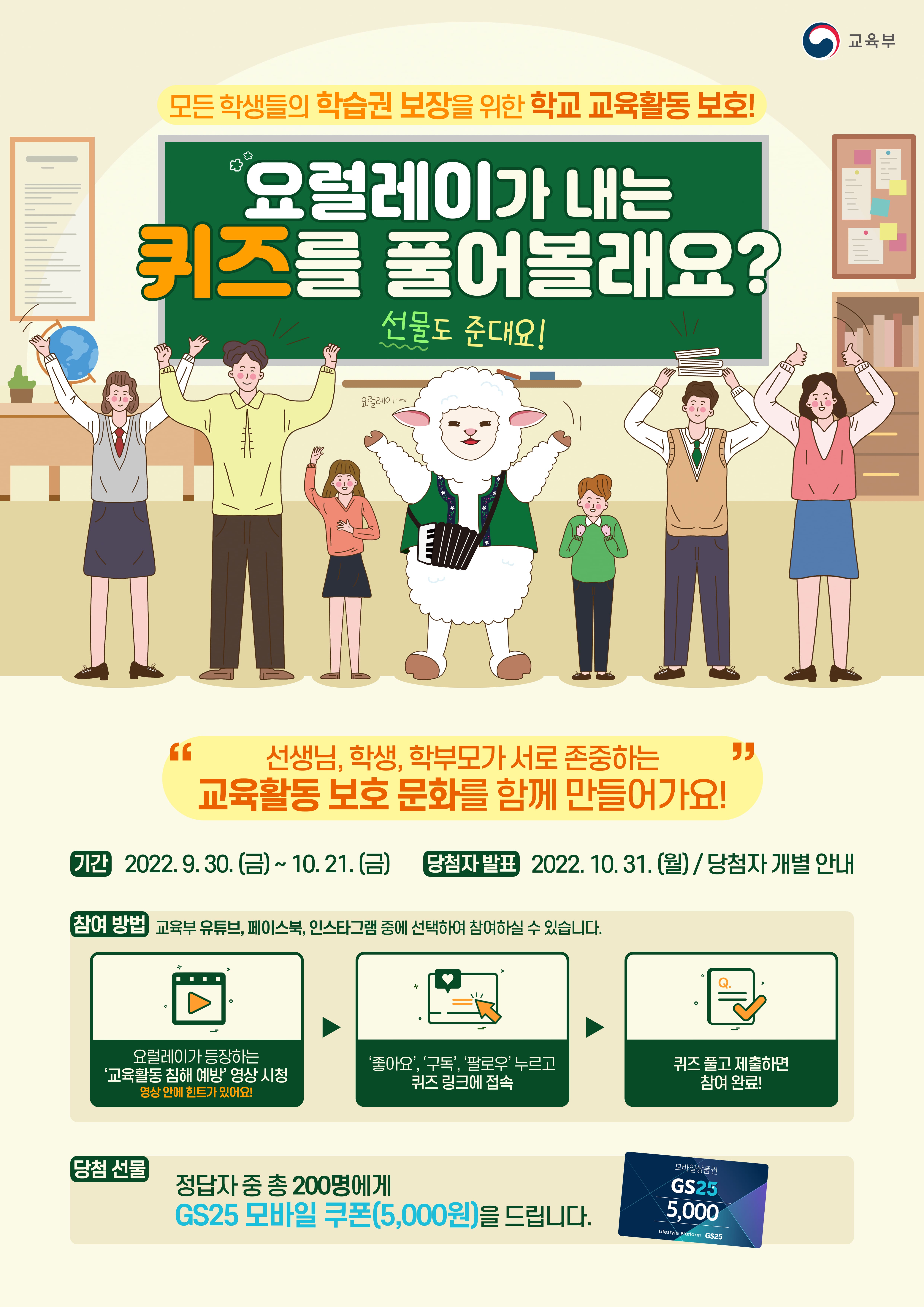 ‘요럴레이와 함께하는 교육활동 침해 예방교육 영상’(교육부 제작)을 안내하오니, 학교구성원(학생,학부모,교사) 모두가 상호 존중하는 학교문화 조성을 위해, 교육자료 활용, 이벤트 참여 등 적극 협조해주시기 바랍니다.