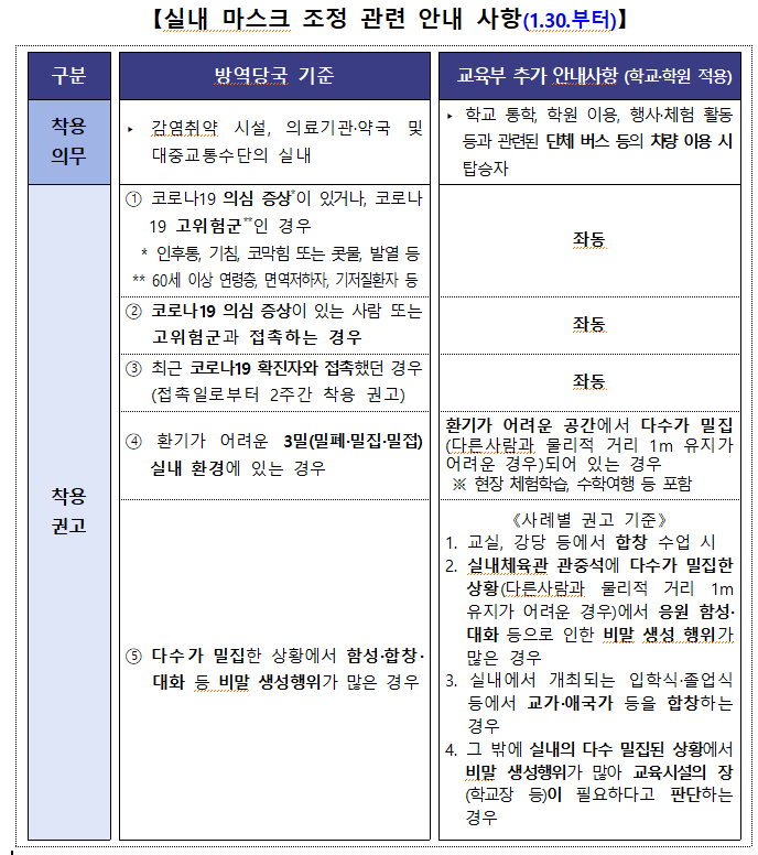 방역당국의 실내 마스크 착용 의무 조정에 따라 1.30(월)부터 학교 실내 마스크 착용이 의무에서 자율적 착용으로 조정됨을 알려드립니다. ('권고'는 법적 구속력은 없으나 나의 건강과 고위험군의 안전을 위해 마스크 착용이 꼭 필요한 상황에서 개인의 자율적 실천을 권하는 것임)