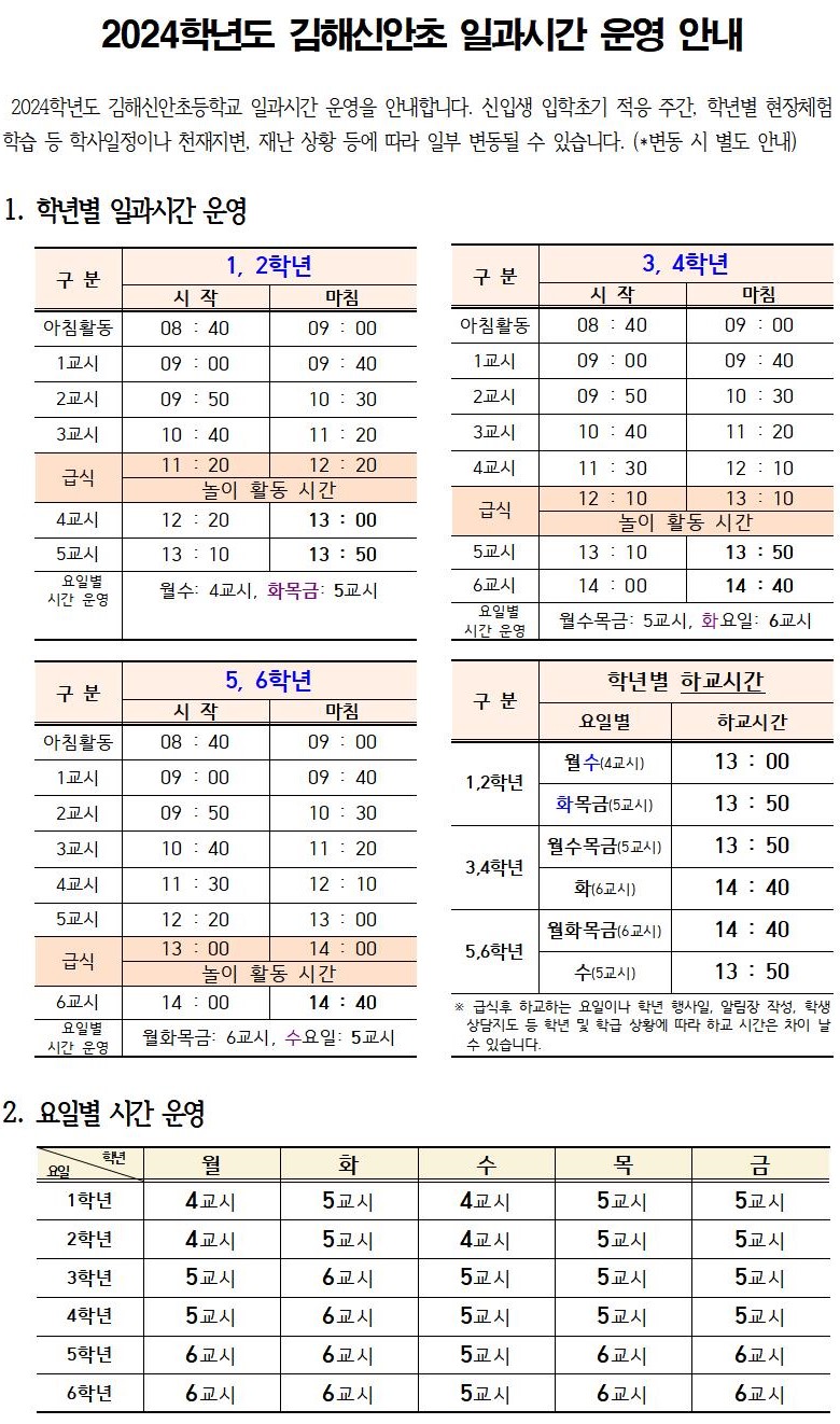 2024학년도 김해신안초등학교 일과시간 운영 및 연간학사일정(첨부)을 같이 안내합니다.