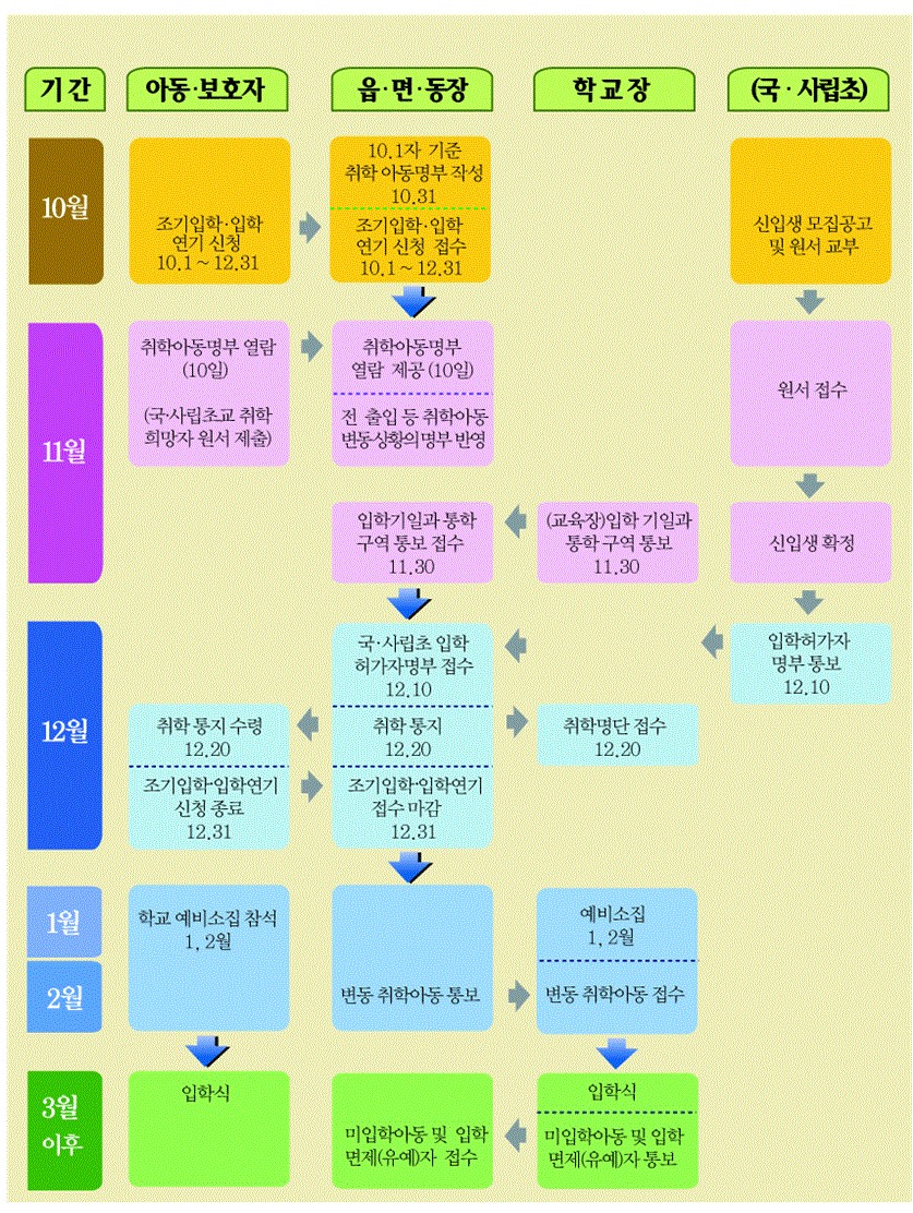 2025학년도 초등학교 취학 절차(경상남도 김해교육지원청)에 대해 첨부와 같이 알려드리니, 2025학년도 자녀의 취학 관련 내용(기간,절차,방법 등) 참고하시기 바랍니다.☞ 조기입학 및 입학연기 신청기간 (2024. 10. 1.~ 2024. 12. 31.), 보호자→읍·면·동 주민센터 신청서 제출