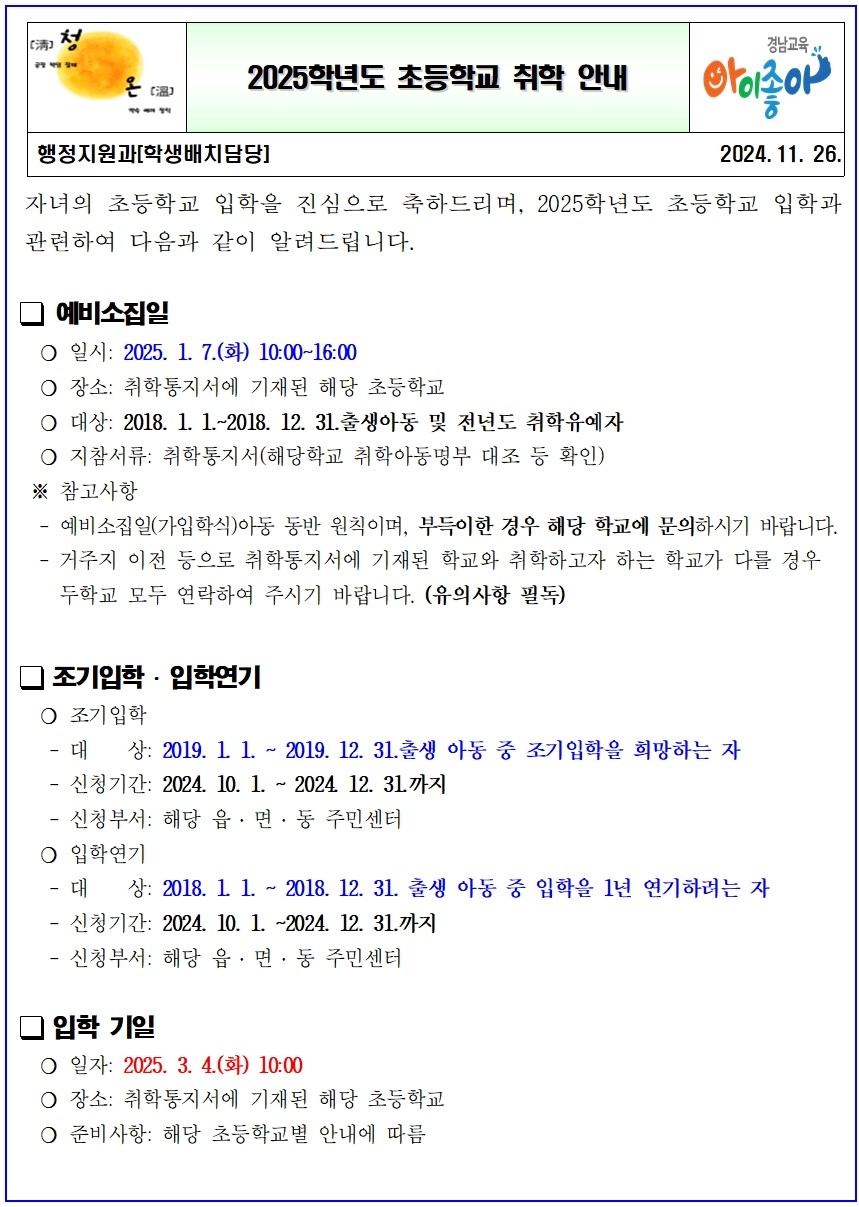 자녀의 초등학교 입학을 진심으로 축하드리며, 2025학년도 초등학교 통학구역 및 입학과 관련하여 아래와 같이 알려드립니다.