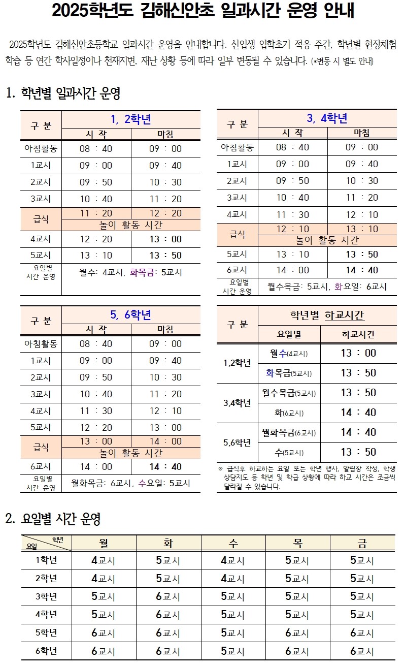 2025학년도 김해신안초등학교 일과시간운영 및 연간학사일정(별첨)입니다.