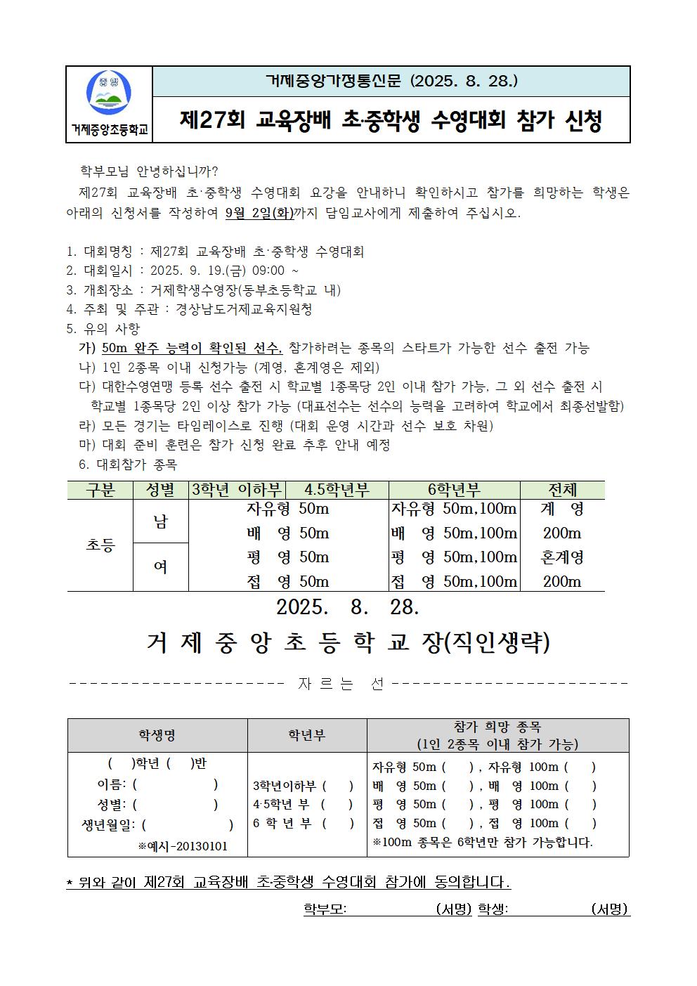 제27회 교육장배 초,중학생 수영대회 참가 신청 안내