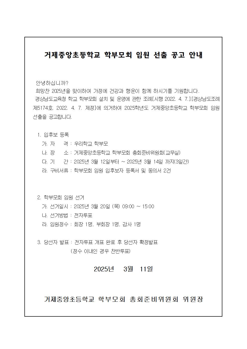 2025학년도 거제중앙초등학교 학부모회 임원 선출 공고 안내