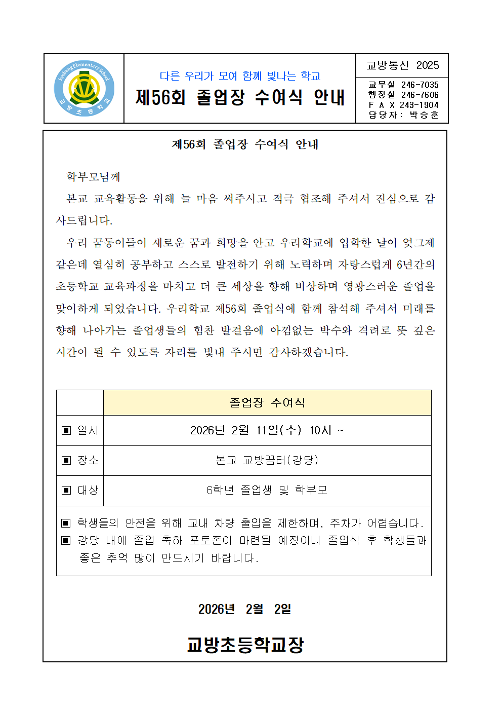 2025학년도 제56회 졸업장 수여식 안내(가정통신문).hwp