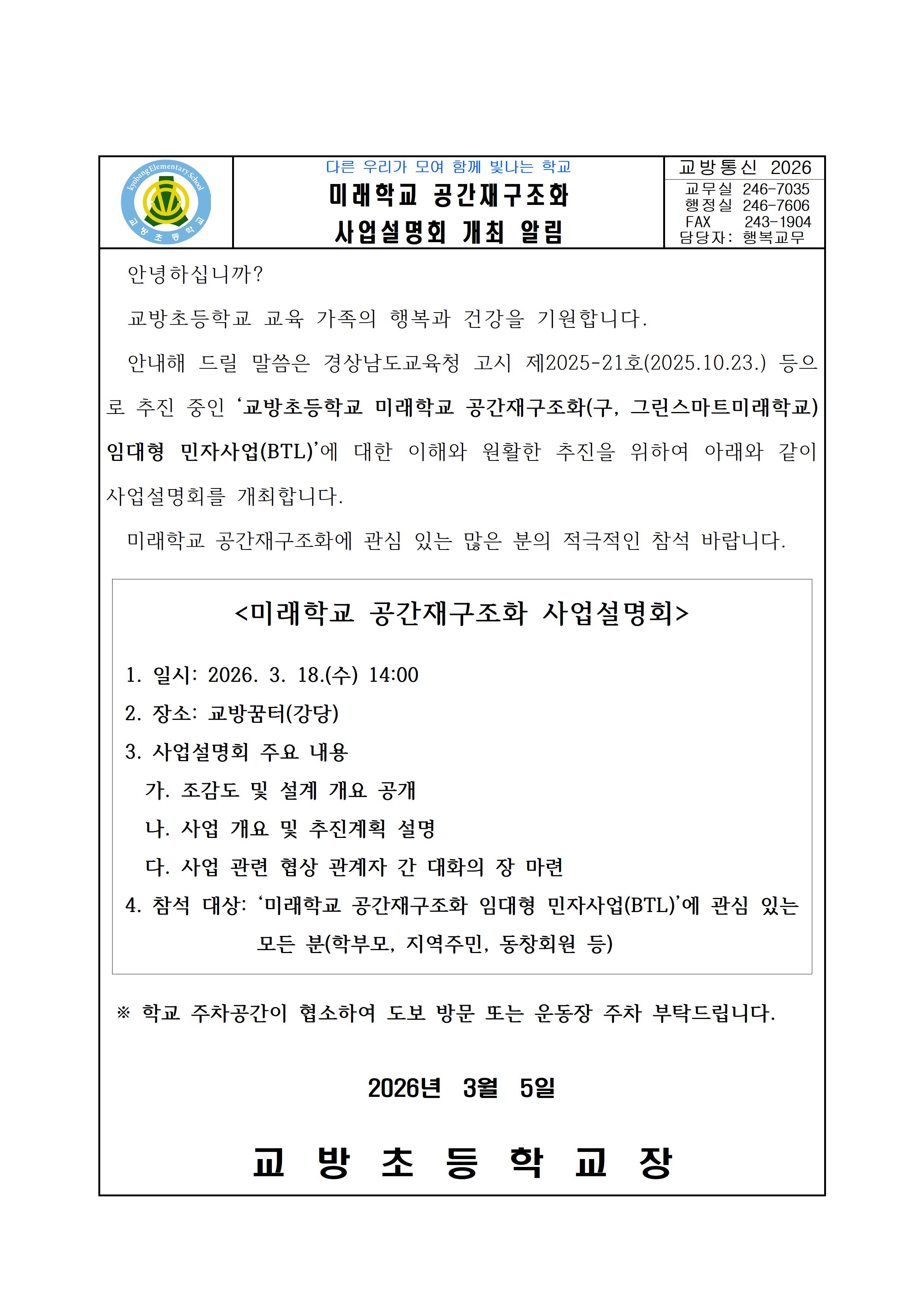 2026학년도 교방초 수업방해행동 학생 지원 보조인력 위촉 재공고