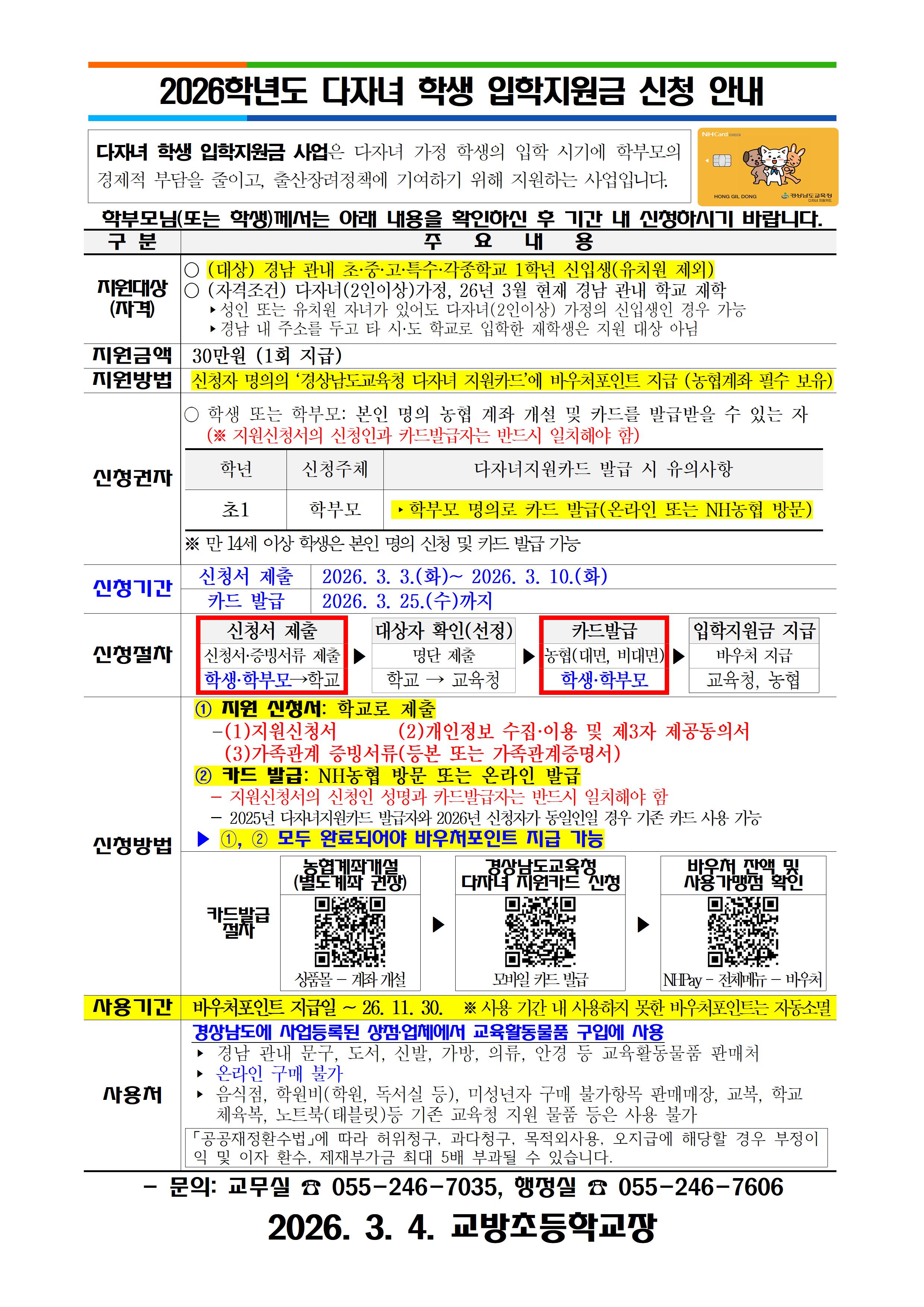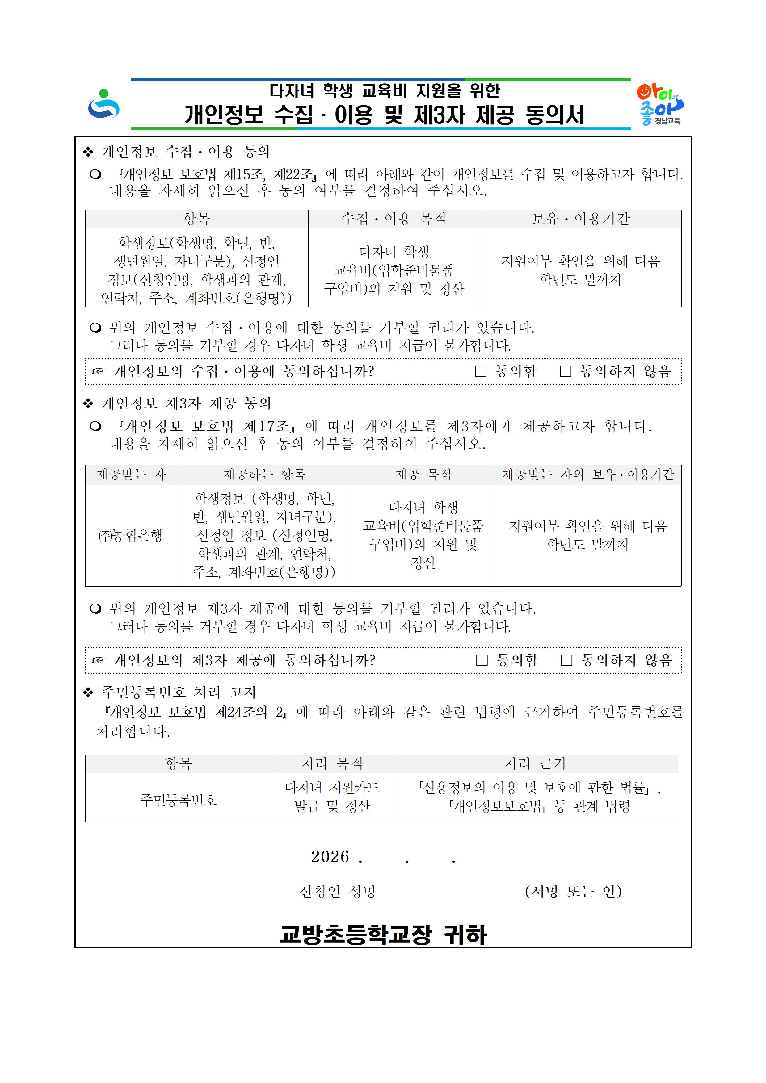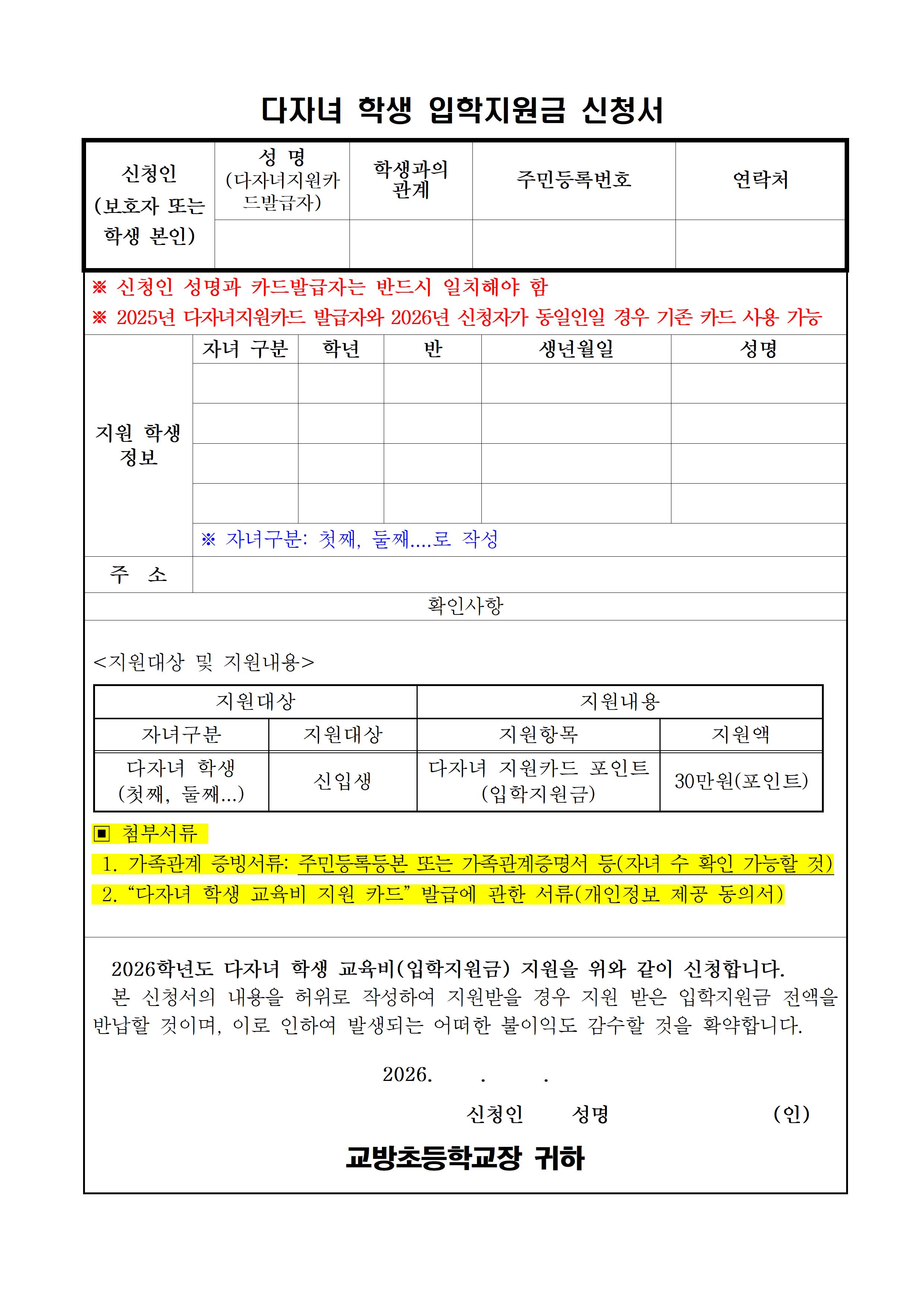 2026학년도 다자녀 학생 입학지원금 신청 안내