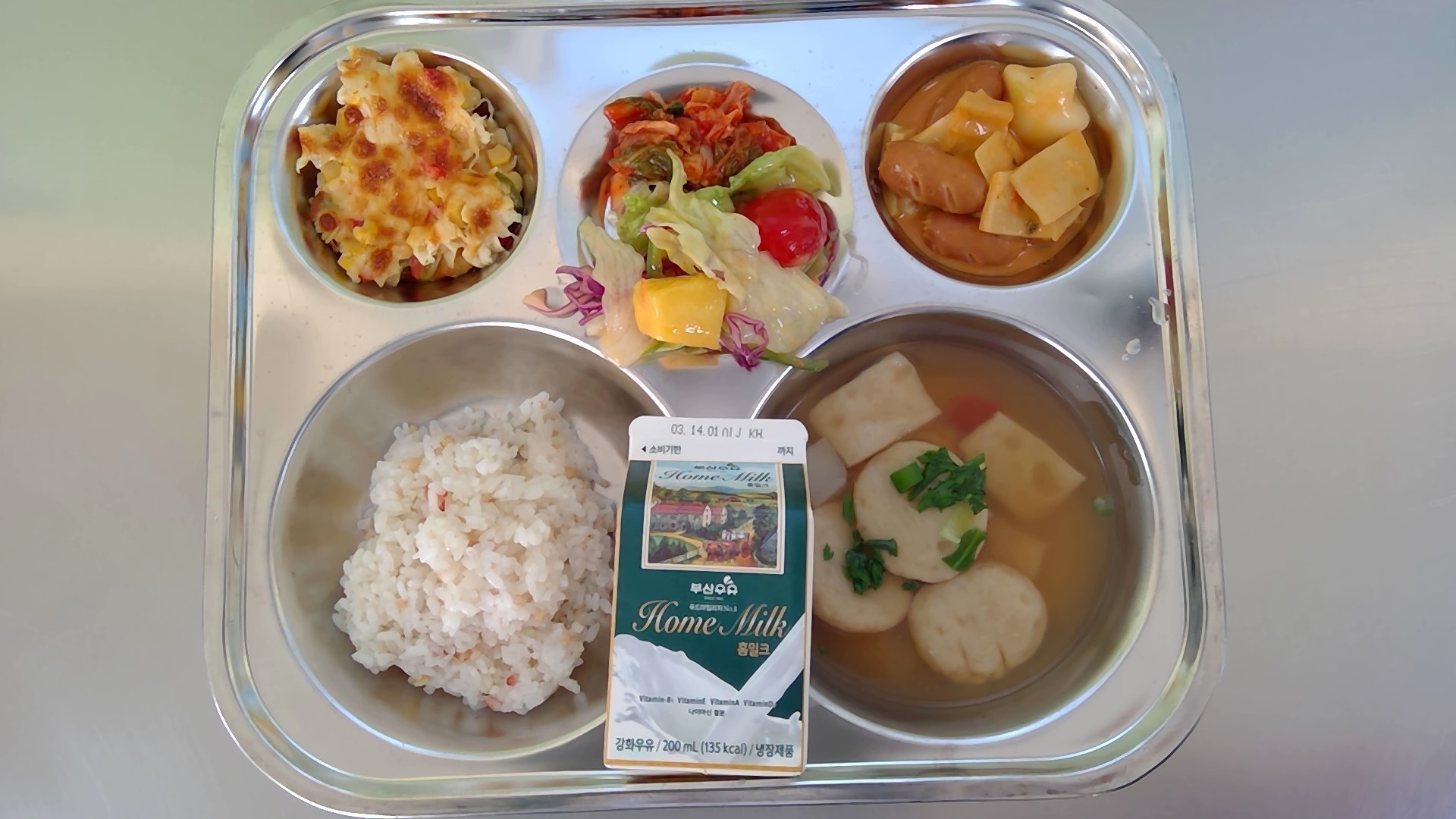 오색현미밥, 모듬어묵국, 로제덕볶이, 옥수수콘치즈구이, 망고샐러드, 배추김치, 우유
