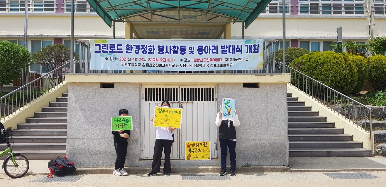 2021년 4월 24일 환경동아리 그린로드 첫발대식과 함께 구)북마산역 임항선웨이길 정화활동을 하였습니다. 학교에서부터 임항선웨이길까지 그린로드친구들 어머니,아버지들과 함께여서 너무 기뻣습니다. 환경의 중요성이 시간이 갈수록 우리들의 마음속 몸속 가까이 다가오는것을 느낍니다. 우리 환경동아리 친구들의 자발적 참여도가 너무 높아 가슴속 뭉클함을 다시 한번도 느꼈습니다. 고사리 같은손으로 어른들이 버린 담배꽁초를 줍는 우리아이들... 이마에는 송골송골 땀이 맺힙니다. 정화활동후 힘들었지만 기뻣하고 말하는 우리아이들을 보니 한층더 성장함을 느낍니다.