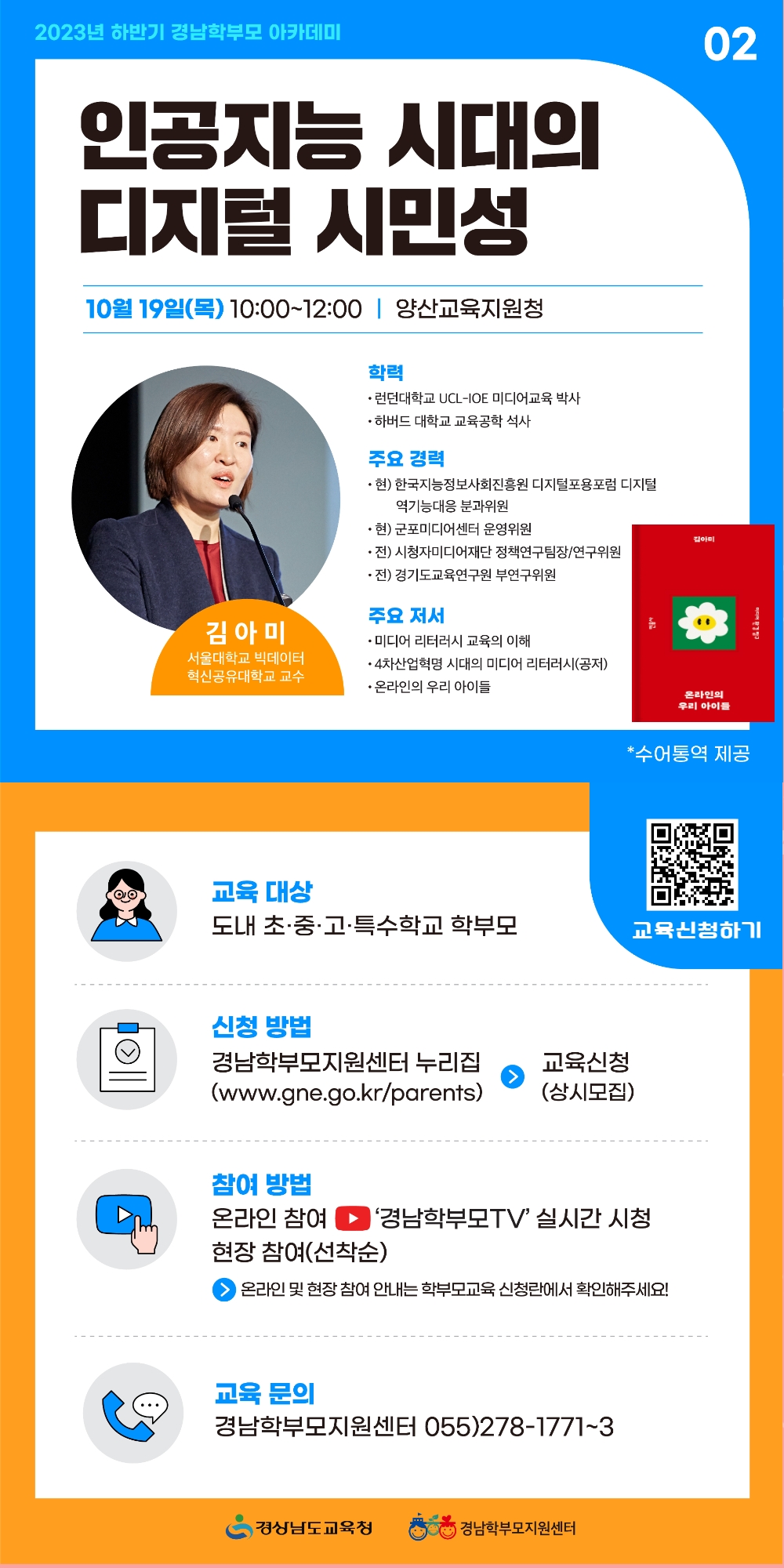 경상남도교육청에서는 부모역할 및 자녀교육 역량 강화 특강 “2023년 하반기 경남학부모 아카데미”를 운영합니다. 학부모들의 많은    관심 바랍니다.