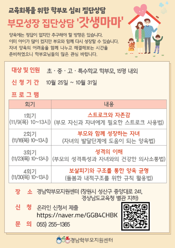 ▣ 프로그램 구분 | 내용 | 과정명 | 부모성장 집단상담 ‘갓생마마’ | 일 시 | 11월 9일~11월 30일 매주 목요일 10:00~13:00 (3시간씩 4회 총 12시간) | 장 소 | 경남학부모지원센터 (창원시 성산구 중앙대로 241) | 신청기간 | 10월 25일 10시 ~ 10월 31일 | 신청방법 | 온라인 신청서 제출(https://naver.me/GG84CHBK) | ※ 신청후 담당자와 사전 인터뷰로 참여자 확정됨을 참고해주세요. |