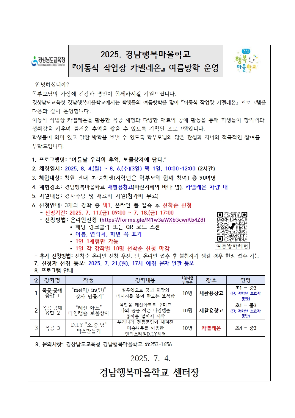 경남행복마을학교{이동식 작업장 카멜레온}여름방학 프로그램 신청 안내