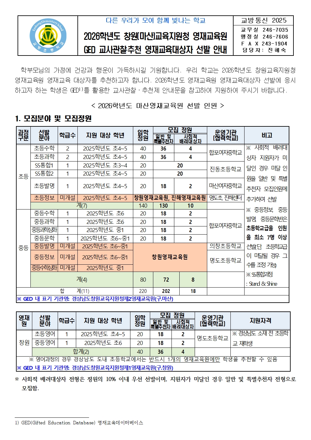 2026학년도 창원(마산)교육지원청 영재교육원 GED 교사관찰?추천 영재교육대상자 선발 안내
