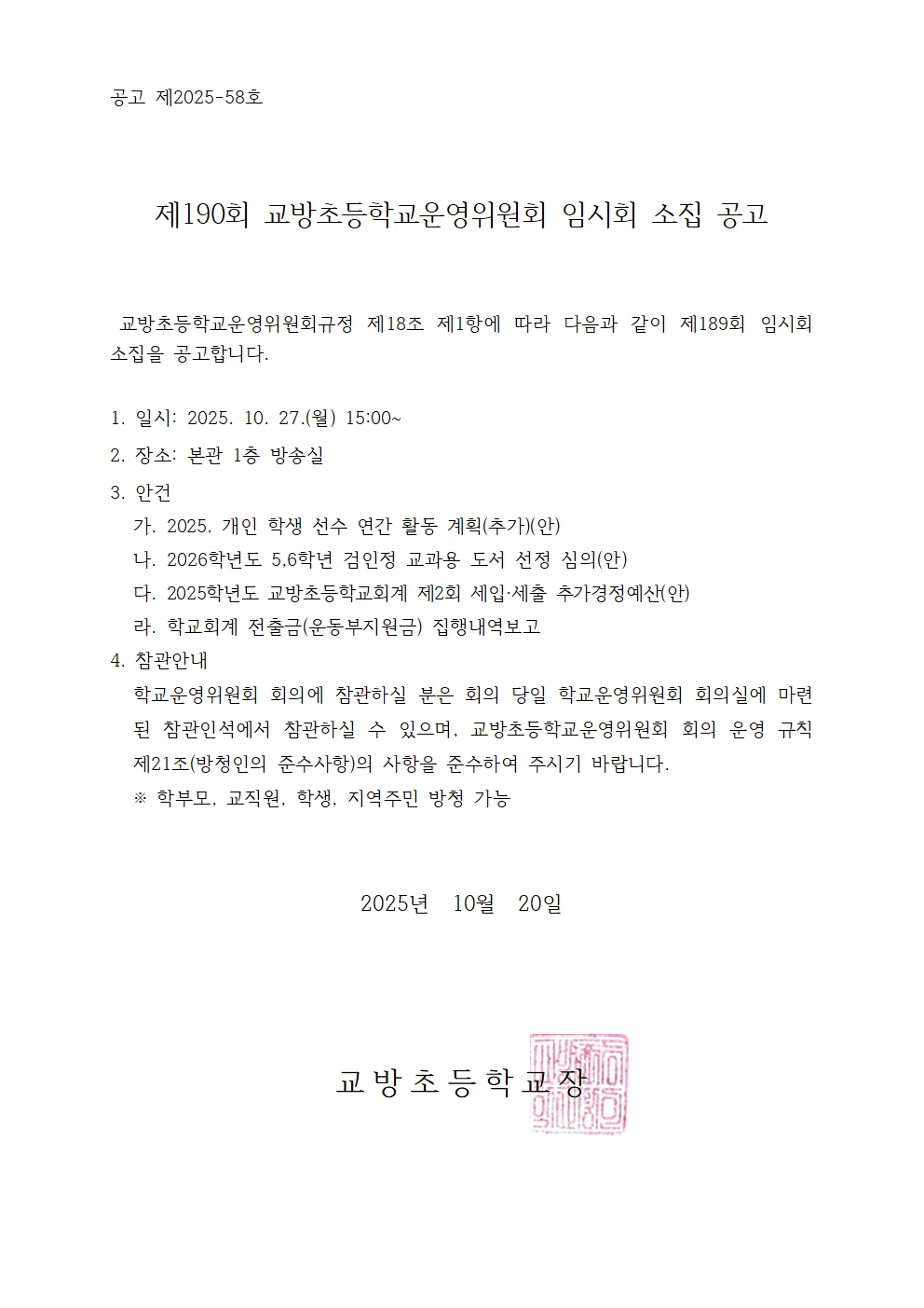 제190회 교방초등학교운영위원회 임시회 소집 공고