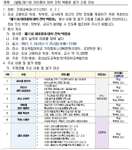 [진양고등학교-6641 (첨부) 경상남도교육청 진로교육과] 제11회 아이좋아 대학 진학 박람회 세부 안내.hwp